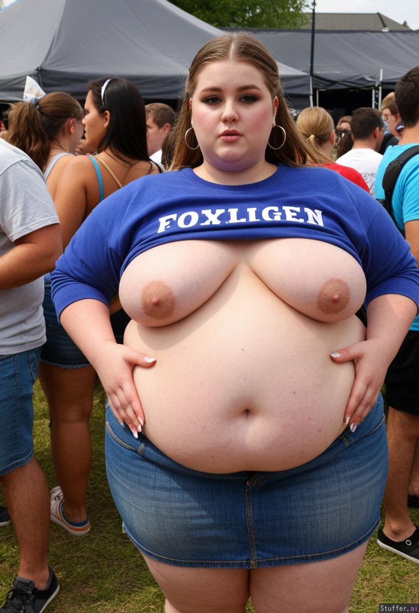 Trendy Fashion photo, obese college student, fully clothed, 21-years-old, wearing a covering ultra bloated and extremely fat-bellied college sweatshirt dress, and fat denim skirt, ultra fat overhanging ballooned-up belly beneath clothing, she is standing at an crowded eating contest in a crowded college festival, ultra attractive symmetrical face of a top model, makeup, earrings, foxy look with eyeliner, fat arms, largest hyper_belly ever seen beneath her clothing, festival vibes, side view, no nudity, afternoon,