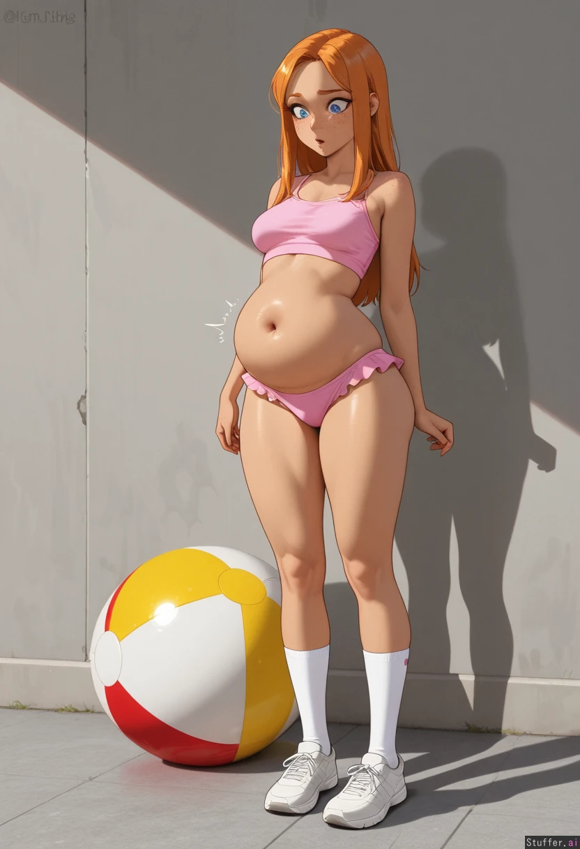 (Milf, mature woman), (long straight hair, ((ginger hair)), blue eyes, freckles, extremely beautiful, supermodel), ((highly detailed face)), goth makeup 8k, high resolution, full resolution, maximum pixel density, best quality, masterpiece, highly detailed, flawless, high rating, highly detailed face, anime woman, solo_female, (((textless_version))) ((She is wearing a light pink crop top and high waisted light pink bikini bottoms. She is wearing white sneakers with white socks.))), (((slutty makeup))), (((light brown skin colour))), (((bimbo))), ((innie navel)), ((standing)), ((shes shocked at the sounds its making belly)), ((she gasp Mouth open in shock)), ((looking down at her belly)) (Curvy), ((slender figure)), ((narrow waist)) ((skinny wide hips))), (((large small breasts))), ((huge round bloated belly:1.8)), ((enormously distended belly)), ((round bloated pot belly)), ((beach ball belly)) ((loud hunger gurgles coming from her belly)), ((((her belly rumbles uncontrollably))