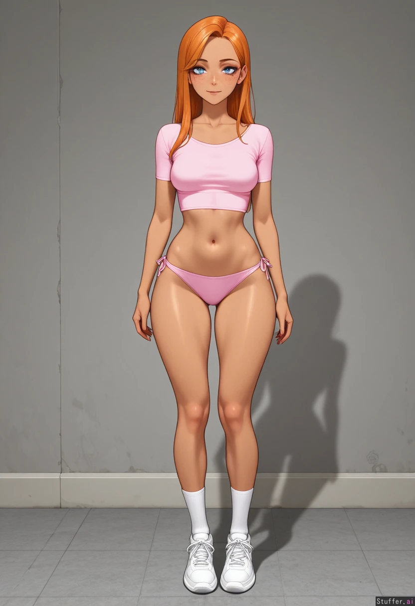 (Milf, mature woman), (long straight hair, ((ginger hair)), blue eyes, freckles, extremely beautiful, supermodel), ((highly detailed face)), goth makeup 8k, high resolution, full resolution, maximum pixel density, best quality, masterpiece, highly detailed, flawless, high rating, highly detailed face, anime woman, solo_female, (((textless_version))) ((She is wearing a light pink crop top and high waisted light pink bikini bottoms. She is wearing white sneakers with white socks.))), (((slutty makeup))), (((light brown skin colour:1.2))), (((bimbo))), ((innie navel)), ((standing)), ((flirty)) (Curvy), ((slender figure)), ((narrow waist)) ((skinny wide hips))), (((large small breasts))),