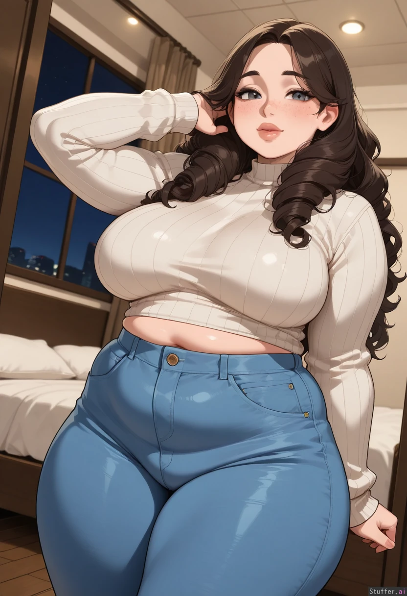 masterpiece, best quality, score_7. krekkov(artists), KAMII MOMORU(artist), beautiful shading, highly detailed, best quality, perfect anatomy, perfect proportions, perfect lighting, pawg, bottomheavy, pearshaped body, super thicc, mega juicy curves, hot girlfriend, overly full massive wide thick full bust, thighs are too fat to hide, (pretty milf, very large and wide, so fat, too thick, mature), stunning beauty, fertile woman, solo ((Vibrant dark_brunette hair)), (curly hair), partially braided no-bangs), thick lips, chubby cheeks with big cheekbones, almond_shape gray eyes beautiful_eyes, looking at viewer, ((love gaze)), blushing, black eyeliner, caring, soft warm skin, body and face freckles, High-waist long mom jeans and snug sweater shirt shes too thick to fuck low angle making her look so breedable Bedroom, night, fantasy , adjusting hair, greatly showing how much she wants to be bred obese thicc skindentation, (Thick, plump), ( engorged round swollen fat firm medium breasts:0.4), Thick fat arms, chubby arms, soft beefy arms, slight burly, soft beefy, (Smooth Taught supple rounded girthy curve details), (Ornate tattoos on body) (very Wide hips:0.4) (enormous fat Thick flabby thighs:0.4) (plump sexy belly) (sexy bloaty inflation) (Navel outline, curve outlines), (Healthy bulk, deep innie navel, navel not pushed out, innie navel, covered navel), (Engorged, sexy inflation, swelling breasts), (Lust and Gluttony),