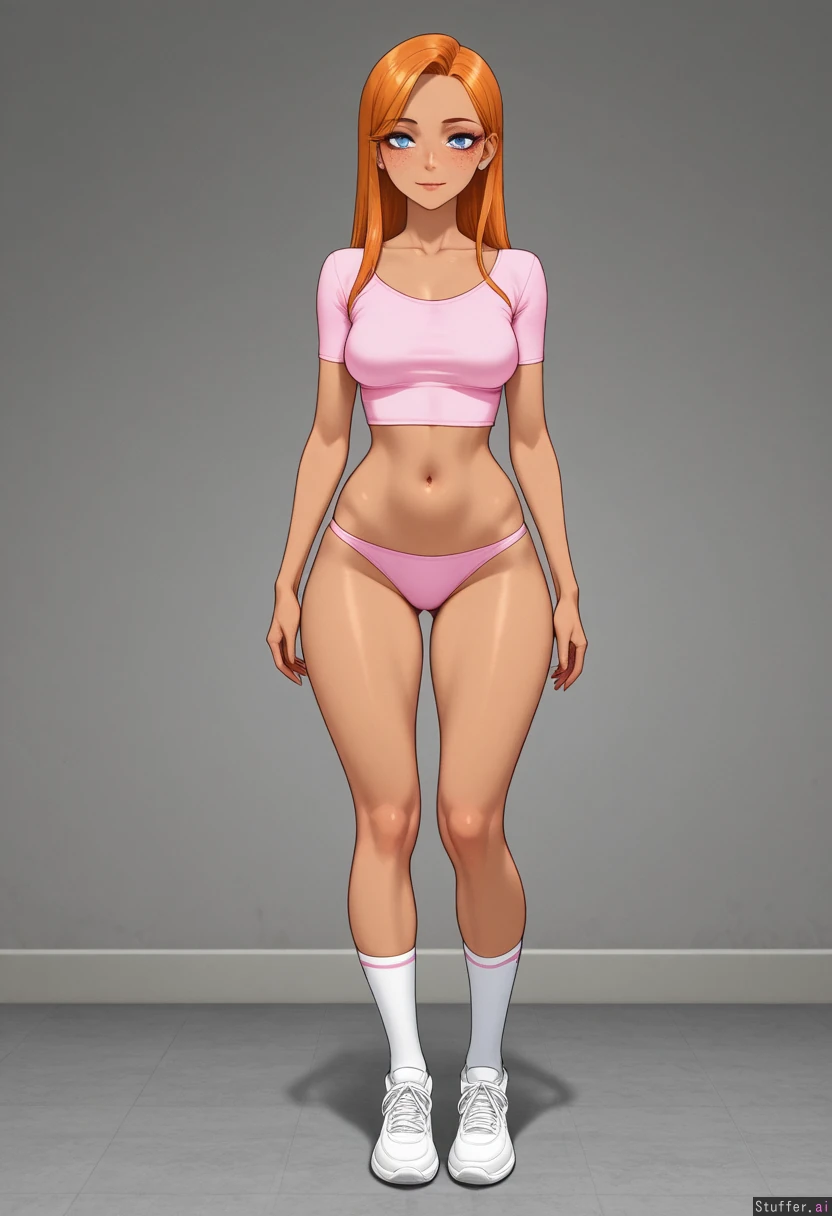 (Milf, mature woman), (long straight hair, ((ginger hair)), blue eyes, freckles, extremely beautiful, supermodel), ((highly detailed face)), goth makeup 8k, high resolution, full resolution, maximum pixel density, best quality, masterpiece, highly detailed, flawless, high rating, highly detailed face, anime woman, solo_female, (((textless_version))) ((She is wearing a light pink crop top and high waisted light pink bikini bottoms. She is wearing white sneakers with white socks.))), (((slutty makeup))), (((light brown skin colour:1.2))), (((bimbo))), ((innie navel)), ((standing)), (Curvy), ((slender figure)), ((narrow waist)) ((skinny wide hips))), (((large small breasts))),