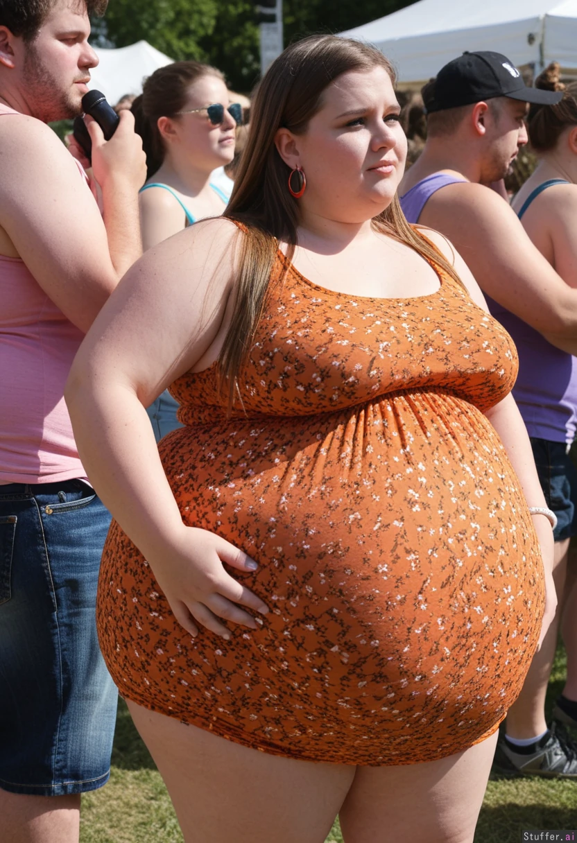 Fully clothed Fashion photo, trendy outfit, obese college student, 21-years-old, wearing ultra bloated and extremely fat-bellied adipose covering sleeveless summerdress with floral micro-pattern, ultra fat overhanging ballooned-up hyper_belly beneath clothing, she is standing at an crowded eating contest in a crowded college festival, ultra attractive symmetrical face of a top model, trendy makeup, earrings, critical look with eyeliner, long straight elegant hair, fat arms, largest hyper_belly ever seen beneath her clothing, festival vibes, side view, no nudity, afternoon,