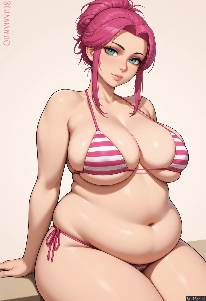 1girl, solo, beautiful, cute, gorgeous, sitting, e-girl, voluminous hair, hair up, Krekkov:artist, sciamano240:artist, betterwithsalt:artist, Wearing pink striped bikini, tight bikini, boob squish, thigh_squish, skindentation, Chubby, ((belly_rest:1.5)), ((super_chubby_belly:1.5)), love_handles, fat_thighs, fattening, fattened hips