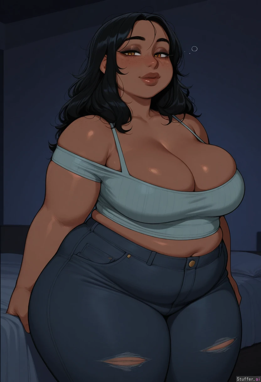 masterpiece, best quality, Kamii momoru, krekkov, best quality, intricate details, hdr, detailed eyes, (soft shading), realistic, dim lighting, realistic lighting, (adult:1.2), 1girl, solo, 1girl, (dark room), mature, sultry, brown skin, subtle eyeshadow, natural lipstick, freckles, Standing, looking at viewer, (sensual smile), (Gold snug offshoulder silk top), ripped black jeans, high waist tight jeans, (Black hair), (long hair, messy hair) beautiful face, cute round amber eyes, nice eyelashes, natural eyeshadow, double chin, ((natural eyeliner, natural lips)) (wide hips, Thick thighs), (obese, chubby:1.22), (deep cleavage, firm breasts, round medium breasts), plump cleavage, (midriff peek, fupa), one navel, Chubby cheeks, horny, (((blushing))), round face, low brow, bored, ((tired)), (luscious big lips),