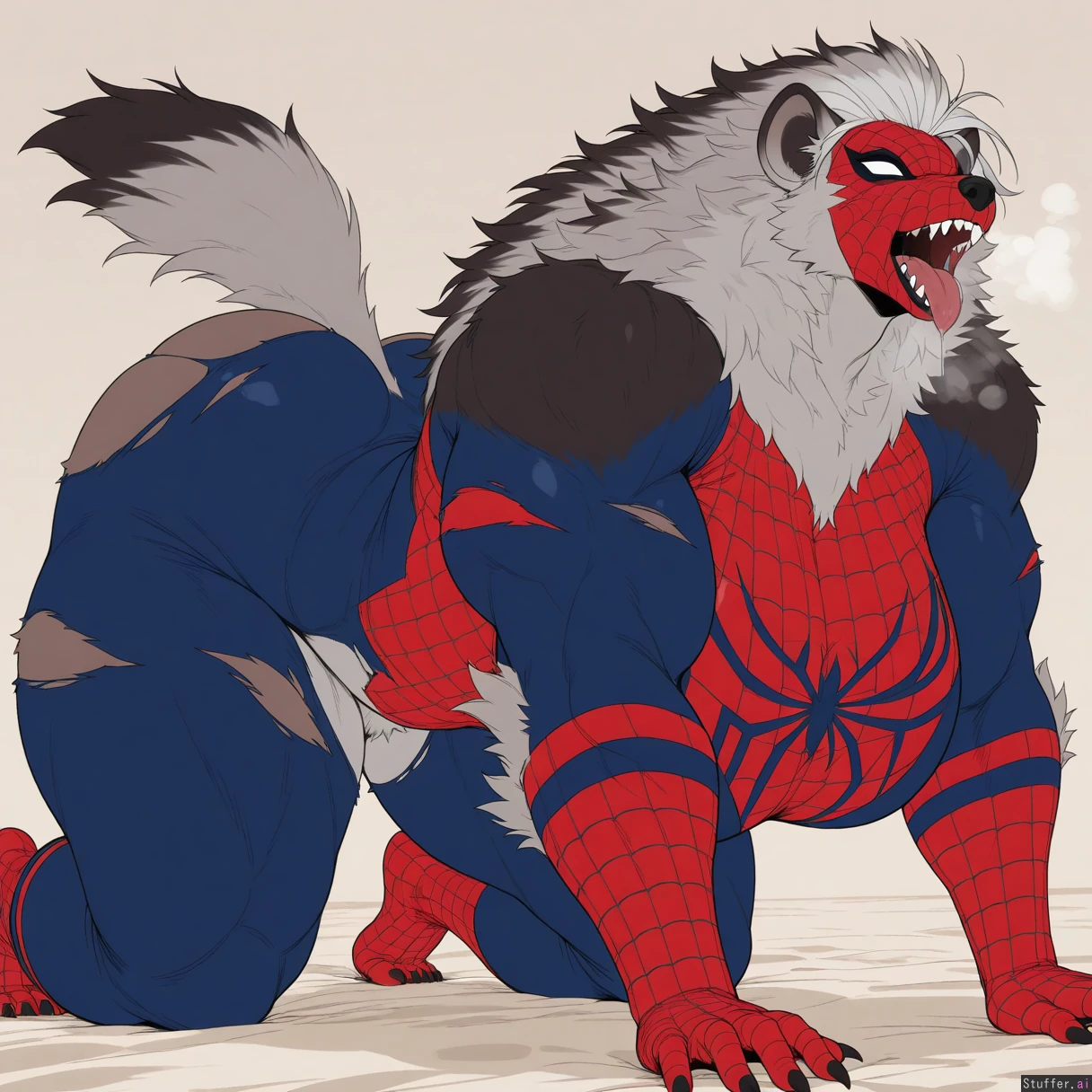 masterpiece, best quality, score_7. masterpiece, best quality, (((flat colors, simple shading, pronounced angles, overexaggerated features, sharp angles, solo))), (small head), giant muscles, ((giant proportions, (hyper muscular hyper thick) hyper bulky female body:1.6, very large wide build, hyper thick hips)), hot and steamy and hot and bothered, ((tall adult female werehyena spider-man, accurate torn red and blue spider-man suit, slutty eyeshadow, spider-man mask)), (plantigrade werehyena claws, torn_clothes, werehyena snout, werehyena snout, aggressively transforming into a feral werehyena, pure red werehyena wild fur, detailed pure red bushy wild fur:1.6, werehyena mane, white eyes, massive pubic_hair_peek), (seductively on beach on all fours, seductively touching her body, (tongue hanging out of mouth, (hot breath, drooling))), (slutty eyeshadow, hot and bothered), (side angle, fingerless gloves)