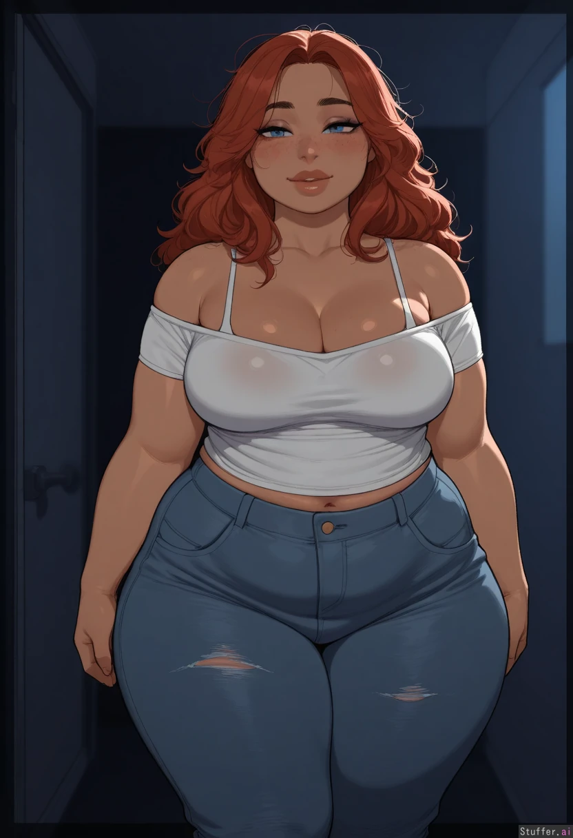 masterpiece, best quality, Kamii momoru, krekkov, best quality, intricate details, hdr, detailed eyes, (soft shading), realistic, dim lighting, realistic lighting, (adult:1.2), 1girl, solo, 1girl, (dark room), mature, sultry, brown skin, subtle eyeshadow, natural lipstick, freckles, Standing, looking at viewer, (sensual smile), (White snug offshoulder top), ripped black jeans, high waist tight jeans, (Crimson hair), (long hair, messy hair) beautiful face, cute round blue eyes, nice eyelashes, natural eyeshadow, double chin, ((natural eyeliner, natural lips)) (wide hips, Thick thighs), (obese, chubby:1.22), (deep cleavage, firm breasts, round medium breasts), plump cleavage, (midriff peek, fupa), one navel, Chubby cheeks, horny, (((blushing))), round face, low brow, bored, ((tired)), (luscious big lips),