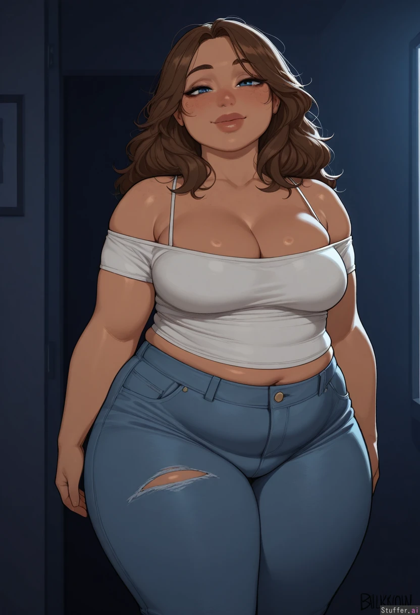 masterpiece, best quality, Kamii momoru, krekkov, best quality, intricate details, hdr, detailed eyes, (soft shading), realistic, dim lighting, realistic lighting, (adult:1.2), 1girl, solo, 1girl, (dark room), mature, sultry, brown skin, subtle eyeshadow, natural lipstick, freckles, Standing, looking at viewer, (sensual smile), (White snug offshoulder top), ripped black jeans, high waist tight jeans, (Brunette hair), (long hair, messy hair) beautiful face, cute round blue eyes, nice eyelashes, natural eyeshadow, double chin, ((natural eyeliner, natural lips)) (wide hips, Thick thighs), (obese, chubby:1.22), (deep cleavage, firm breasts, round medium breasts), plump cleavage, (midriff peek, fupa), one navel, Chubby cheeks, horny, (((blushing))), round face, low brow, bored, ((tired)), (luscious big lips),