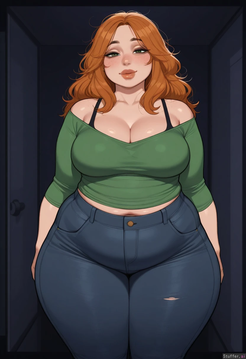 masterpiece, best quality, Kamii momoru, krekkov, best quality, intricate details, hdr, detailed eyes, (soft shading), realistic, dim lighting, realistic lighting, (adult:1.2), 1girl, solo, 1girl, (dark room), mature, sultry, porcelain skin, subtle eyeshadow, natural lipstick, freckles, Standing, looking at viewer, (sensual smile), (Green snug offshoulder top), ripped black jeans, high waist tight jeans, (Orange hair), (long hair, messy hair) beautiful face, cute round green eyes, nice eyelashes, natural eyeshadow, double chin, ((natural eyeliner, natural lips)) (wide hips, Thick thighs), (obese, chubby:1.22), (deep cleavage, firm breasts, round medium breasts), plump cleavage, (midriff peek, fupa), one navel, Chubby cheeks, horny, (((blushing))), round face, low brow, bored, ((tired)), (luscious big lips), thick obese, overfed, overfilled, overloaded, sexy inflation, swelling breasts,