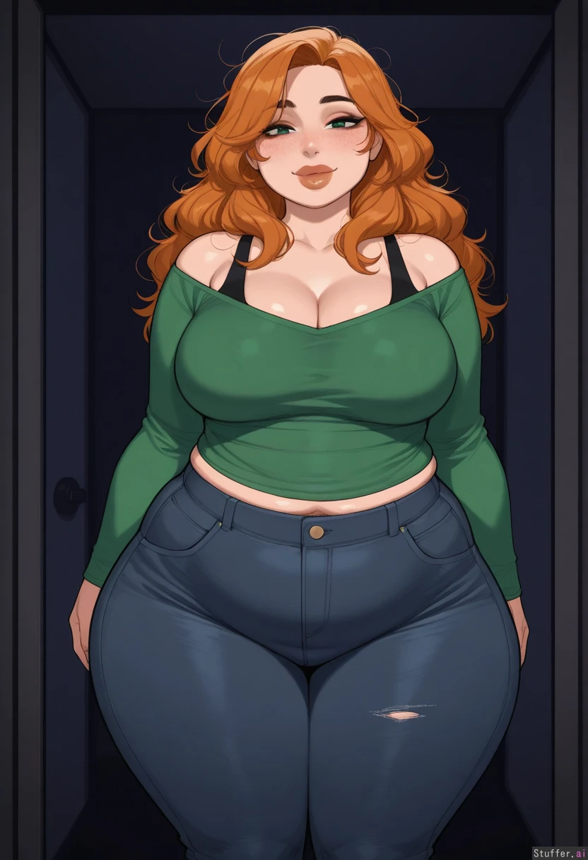 masterpiece, best quality, Kamii momoru, krekkov, best quality, intricate details, hdr, detailed eyes, (soft shading), realistic, dim lighting, realistic lighting, (adult:1.2), 1girl, solo, 1girl, (dark room), mature, sultry, porcelain skin, subtle eyeshadow, natural lipstick, freckles, Standing, looking at viewer, (sensual smile), (Green snug offshoulder top), ripped black jeans, high waist tight jeans, (Orange hair), (long hair, messy hair) beautiful face, cute round green eyes, nice eyelashes, natural eyeshadow, double chin, ((natural eyeliner, natural lips)) (wide hips, Thick thighs), (obese, chubby:1.22), (deep cleavage, firm breasts, round medium breasts), plump cleavage, (midriff peek, fupa), one navel, Chubby cheeks, horny, (((blushing))), round face, low brow, bored, ((tired)), (luscious big lips), thick obese, overfed, overfilled, overloaded, sexy inflation, swelling breasts, bloating, implied_vore, (lust and gluttony),