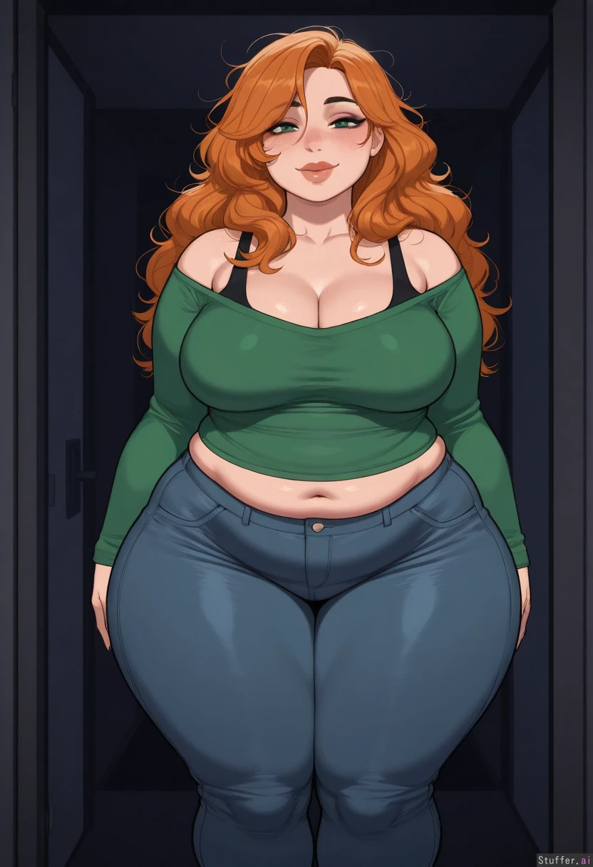masterpiece, best quality, Kamii momoru, krekkov, best quality, intricate details, hdr, detailed eyes, (soft shading), realistic, dim lighting, realistic lighting, (adult:1.2), 1girl, solo, 1girl, (dark room), mature, sultry, porcelain skin, subtle eyeshadow, natural lipstick, freckles, (Zuzanna(BigBigonDA)) Standing, looking at viewer, (sensual smile), (Green snug offshoulder top), ripped black jeans, high waist tight jeans, (Orange hair), (long hair, messy hair) beautiful face, cute round green eyes, nice eyelashes, natural eyeshadow, double chin, ((natural eyeliner, natural lips)) (wide hips, Thick thighs), (obese, chubby:1.22), (deep cleavage, firm breasts, round medium breasts), plump cleavage, (midriff peek, fupa), one navel, Chubby cheeks, horny, (((blushing))), round face, low brow, bored, ((tired)), (luscious big lips), thick obese, overfed, overfilled, overloaded, sexy inflation, swelling breasts, bloating, implied_vore, (lust and gluttony),