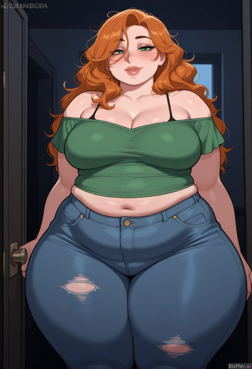 masterpiece, best quality, Kamii momoru, krekkov, best quality, intricate details, hdr, detailed eyes, (soft shading), realistic, dim lighting, realistic lighting, (adult:1.2), 1girl, solo, 1girl, (dark room), mature, sultry, porcelain skin, subtle eyeshadow, natural lipstick, freckles, (Zuzanna(BigBigonDA)) Standing, looking at viewer, (sensual smile), (Green snug offshoulder top), ripped black jeans, high waist tight jeans, (Orange hair), (long hair, messy hair) beautiful face, cute round green eyes, nice eyelashes, natural eyeshadow, double chin, ((natural eyeliner, natural lips)) (wide hips, Thick thighs), (obese, chubby:1.22), (deep cleavage, firm breasts, round medium breasts), plump cleavage, (midriff peek, fupa), one navel, heavy bulk, rounded curves, Chubby cheeks, horny, (((blushing))), round face, low brow, bored, ((tired)), (luscious big lips), thick obese, overfed, overfilled, overloaded, sexy inflation, swelling breasts, bloating, implied_vore, (lust and gluttony),