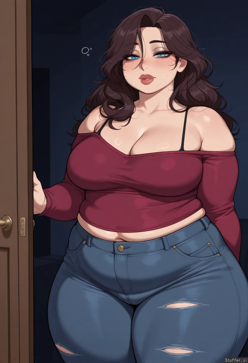 masterpiece, best quality, Kamii momoru, krekkov, best quality, intricate details, hdr, detailed eyes, (soft shading), realistic, dim lighting, realistic lighting, (adult:1.2), 1girl, solo, 1girl, (dark room), mature, sultry, porcelain skin, subtle eyeshadow, natural lipstick, freckles, (Zuzanna(BigBigonDA)) Standing, looking at viewer, (sensual smile), (Pastel_rainbow snug offshoulder top), ripped black jeans, high waist tight jeans, (Brunette hair), (long hair, messy hair) beautiful face, cute round blue eyes, nice eyelashes, natural eyeshadow, double chin, ((natural eyeliner, natural lips)) (wide hips, Thick thighs), (obese, chubby:1.22), (deep cleavage, firm breasts, round medium breasts), plump cleavage, (midriff peek, fupa), one navel, heavy bulk, rounded curves, Chubby cheeks, horny, (((blushing))), round face, low brow, bored, ((tired)), (luscious big lips), thick obese, overfed, overfilled, overloaded, sexy inflation, swelling breasts, bloating, implied_vore, (lust and gluttony),