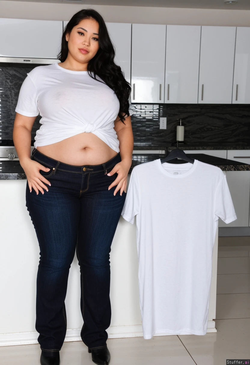 (30 year old Filipina) Hands on front of lower belly sides Extra long black wavy hair, Modern kitchen, (((Huge Dark opened jeans, loose huge white tshirt, ))) Enormous soft plump belly, long breasts, full hips, enormous gunt
