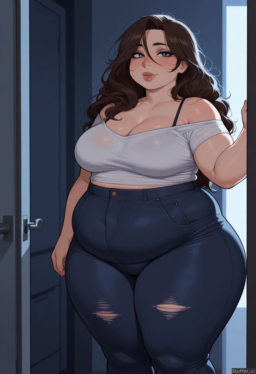 masterpiece, best quality, Kamii momoru, krekkov, best quality, intricate details, hdr, detailed eyes, (soft shading), realistic, dim lighting, realistic lighting, (adult:1.2), 1girl, solo, 1girl, (dark room), mature, sultry, porcelain skin, subtle eyeshadow, natural lipstick, freckles, (Zuzanna(BigBigonDA)) Standing, looking at viewer, (sensual smile), (Pastel_rainbow snug offshoulder top), ripped black jeans, high waist tight jeans, (Brunette hair), (long hair, messy hair) beautiful face, cute round blue eyes, nice eyelashes, natural eyeshadow, double chin, ((natural eyeliner, natural lips)) (wide hips, Thick thighs), (obese, chubby:1.22), (deep cleavage, firm breasts, round medium breasts), plump cleavage, (midriff peek, fupa), one navel, heavy bulk, rounded curves, Chubby cheeks, horny, (((blushing))), round face, low brow, bored, ((tired)), (luscious big lips), thick obese, overfed, overfilled, overloaded, sexy inflation, swelling breasts, very full, bloating, implied_vore, (lust and gluttony),
