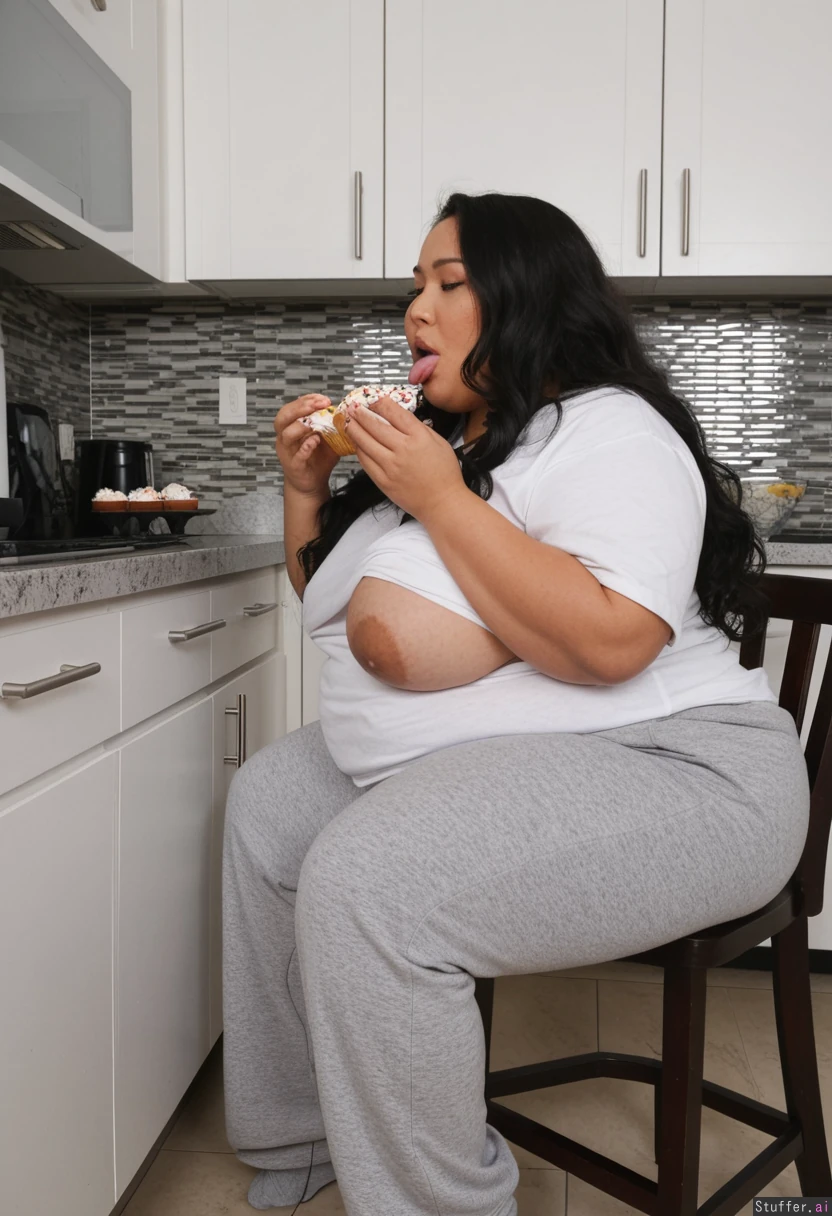 (30 year old Filipina) Hands on front of lower belly sides Extra long black wavy hair, Modern kitchen, sitting on chair, (((Huge grey sweatpants , loose huge white tshirt, ))) Enormous soft plump belly, long breasts, full hips, enormous gunt (Side view, )stuffing herself with cupcakes, caught eating cupcakes ,