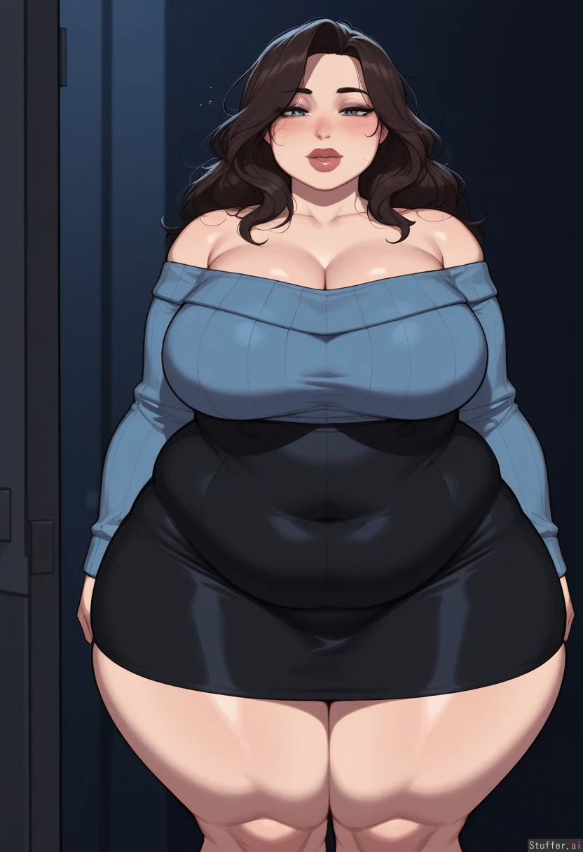 masterpiece, best quality, Kamii momoru, krekkov, best quality, intricate details, hdr, detailed eyes, (soft shading), realistic, dim lighting, realistic lighting, (adult:1.2), 1girl, solo, 1girl, (dark room), mature, sultry, porcelain skin, subtle eyeshadow, natural lipstick, freckles, (Zuzanna(BigBigonDA)) Standing, looking at viewer, (sensual smile), (Pastel_rainbow snug offshoulder top), long black pencil skirt, high waist tight skirt, (Brunette hair), (long hair, messy hair) beautiful face, cute round blue eyes, nice eyelashes, natural eyeshadow, double chin, ((natural eyeliner, natural lips)) (wide hips, Thick thighs), (obese, chubby:1.22), (deep cleavage, firm breasts, round medium breasts), plump cleavage, (curve outlines, fupa), one navel, heavy bulk, rounded curves, Chubby cheeks, horny, (((blushing))), round face, low brow, bored, ((tired)), (luscious big lips), thick obese, (lust and gluttony),