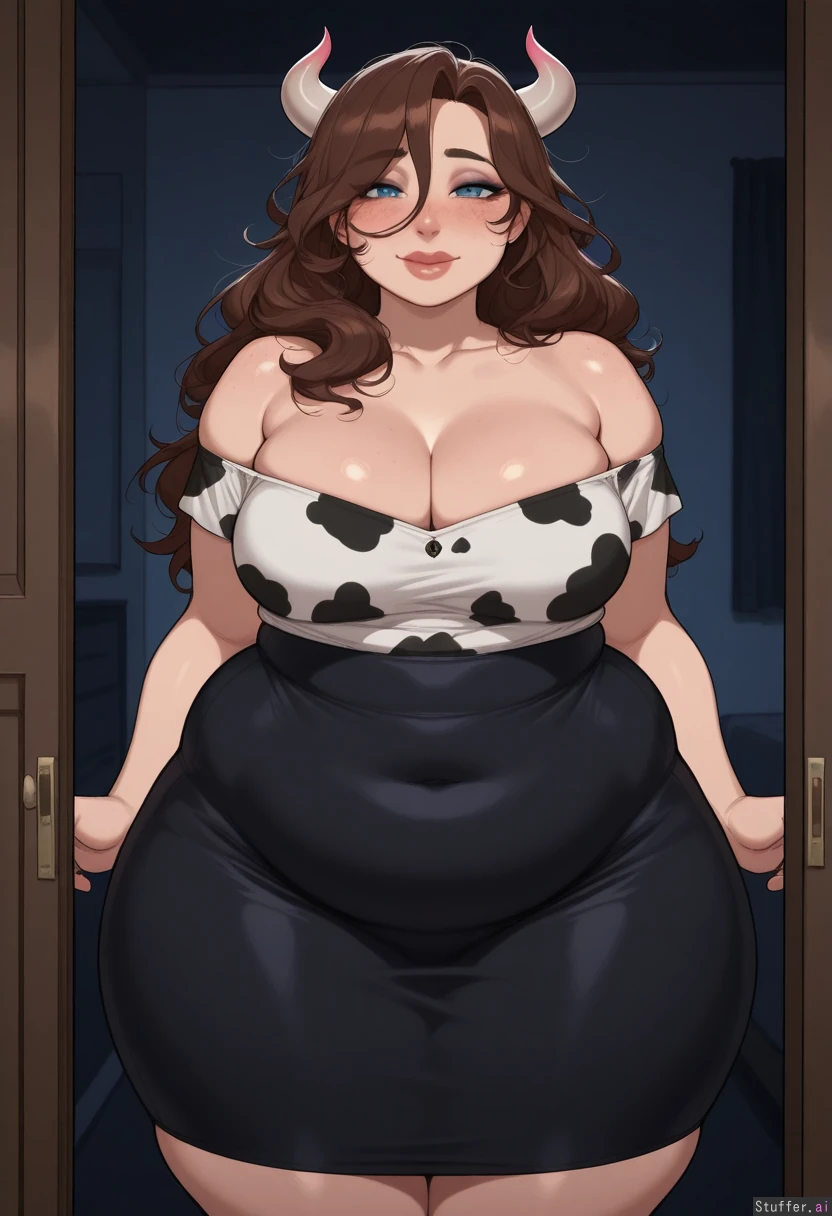 masterpiece, best quality, Kamii momoru, krekkov, best quality, intricate details, hdr, detailed eyes, (soft shading), realistic, dim lighting, realistic lighting, (adult:1.2), 1girl, solo, 1girl, (dark room), mature, sultry, porcelain skin, subtle eyeshadow, natural lipstick, freckles, (Zuzanna(BigBigonDA)), fertile breedable feedee-breedee, Standing, looking at viewer, (sensual smile), (Cowprint-pattern snug offshoulder top), long black pencil skirt, high waist tight skirt, (Brunette hair), (long hair, messy hair), vestigial brown cow ears, vestigial small cow horns, beautiful face, cute round blue eyes, nice eyelashes, natural eyeshadow, double chin, ((natural eyeliner, natural lips)) (wide hips, Thick thighs), (obese, chubby:1.22), (deep cleavage, firm breasts, engorged medium breasts), full cleavage, (curve outlines, fupa), one navel, heavy bulk, rounded curves, Chubby cheeks, horny, (((blushing))), round face, low brow, flirty, ((tired)), (luscious big lips), healthy athletic thick obese, (lust and gluttony), ready to breed, looking like she might pop,