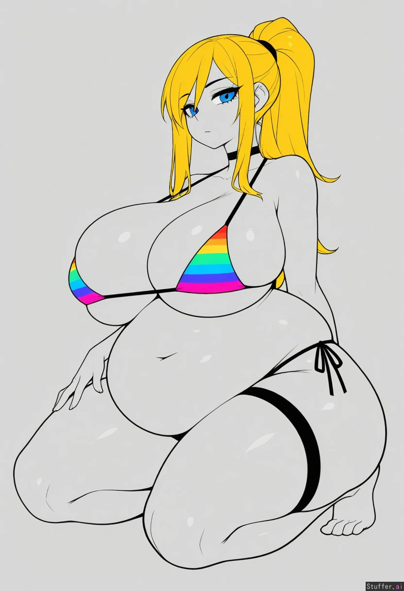 (flat colors, blank background, vibrant flat colors, minimalist flat-color illustration, minimalistic flat colors, minimalistic cartoon style, less detail, simple line art, simplistic art style, minimalistic art style, flat design, monochrome, greyscale). (Lewdlemage, Kipteitei, betterwithsalt, usa37107692, zyugoya, limebreaker, spellsX, Blushyspicy, Metalforever, KAMII MOMORU, RockSolidArt). (1woman, Samus Aran). (stunning beauty, beautiful beauty, cute beauty, gorgeous beauty). ((in a bikini)) (extremely massive breasts, extremely massive morbidly obese breasts, extremely massive morbidly obese body, extremely massive morbidly obese thighs). (extremely massive morbidly obese belly:1.1). (). (serious). ((Colorful)). (blonde hair color, long hair, hair tied into a ponytail). (blue eyes). (kneeling on one knee).