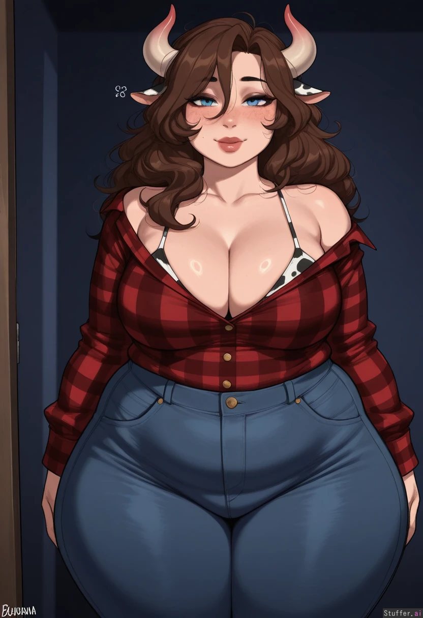 masterpiece, best quality, Kamii momoru, krekkov, best quality, intricate details, hdr, detailed eyes, (soft shading), realistic, dim lighting, realistic lighting, (adult:1.2), 1girl, solo, 1girl, (dark room), mature, sultry, porcelain skin, subtle eyeshadow, natural lipstick, freckles, (Zuzanna(BigBigonDA)), fertile breedable feedee-breedee, Standing, looking at viewer, (sensual smile), (Cowprint-pattern snug offshoulder top), long black milf jeans, high waist snug jeans, open red flannel shirt, (Brunette hair), (long hair, messy hair), vestigial brown cow ears, vestigial small cow horns, beautiful face, cute round blue eyes, nice eyelashes, natural eyeshadow, double chin, ((natural eyeliner, natural lips)) (wide hips, Thick thighs), (obese, chubby:1.22), (deep cleavage, firm breasts, engorged medium breasts), full cleavage, (curve outlines, fupa), one navel, heavy bulk, rounded curves, Chubby cheeks, horny, (((blushing))), round face, low brow, flirty, ((tired)), (luscious big lips), healthy athletic thick obese, (lust and gluttony), ready to breed, looking like she might pop,