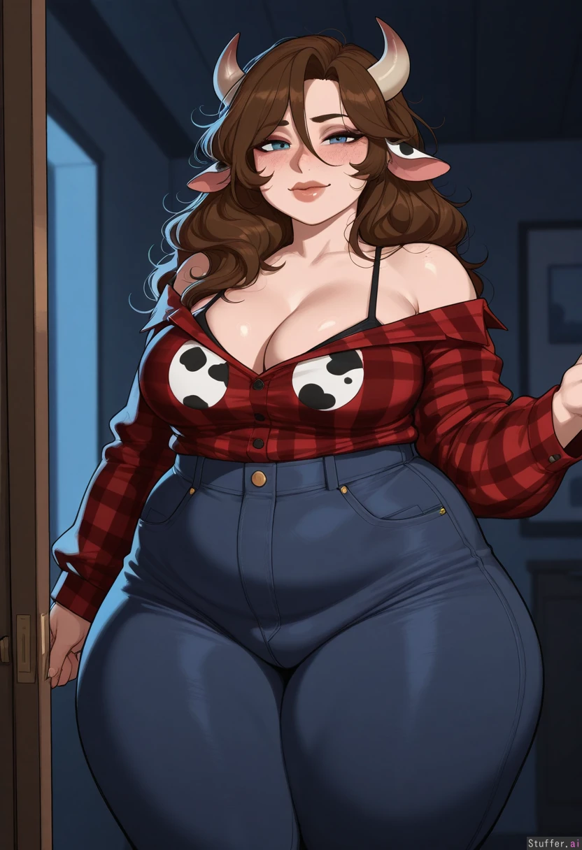 masterpiece, best quality, Kamii momoru, krekkov, best quality, intricate details, hdr, detailed eyes, (soft shading), realistic, dim lighting, realistic lighting, (adult:1.2), 1girl, solo, 1girl, (dark room), mature, sultry, porcelain skin, subtle eyeshadow, natural lipstick, freckles, (Zuzanna(BigBigonDA)), fertile breedable feedee-breedee, Standing, looking at viewer, (sensual smile), (Cowprint-pattern snug offshoulder top), long black milf jeans, high waist snug jeans, open red flannel shirt, (Brunette hair), (long hair, messy hair), vestigial brown cow ears, vestigial small cow horns, beautiful face, cute round blue eyes, nice eyelashes, natural eyeshadow, double chin, ((natural eyeliner, natural lips)) (wide hips, Thick thighs), (obese, chubby:1.22), (deep cleavage, firm breasts, engorged medium breasts), full cleavage, (curve outlines, fupa), one navel, heavy bulk, rounded curves, Chubby cheeks, horny, (((blushing))), round face, low brow, flirty, ((tired)), (luscious big lips), healthy athletic thick obese, (lust and gluttony), ready to breed, looking like she might pop,