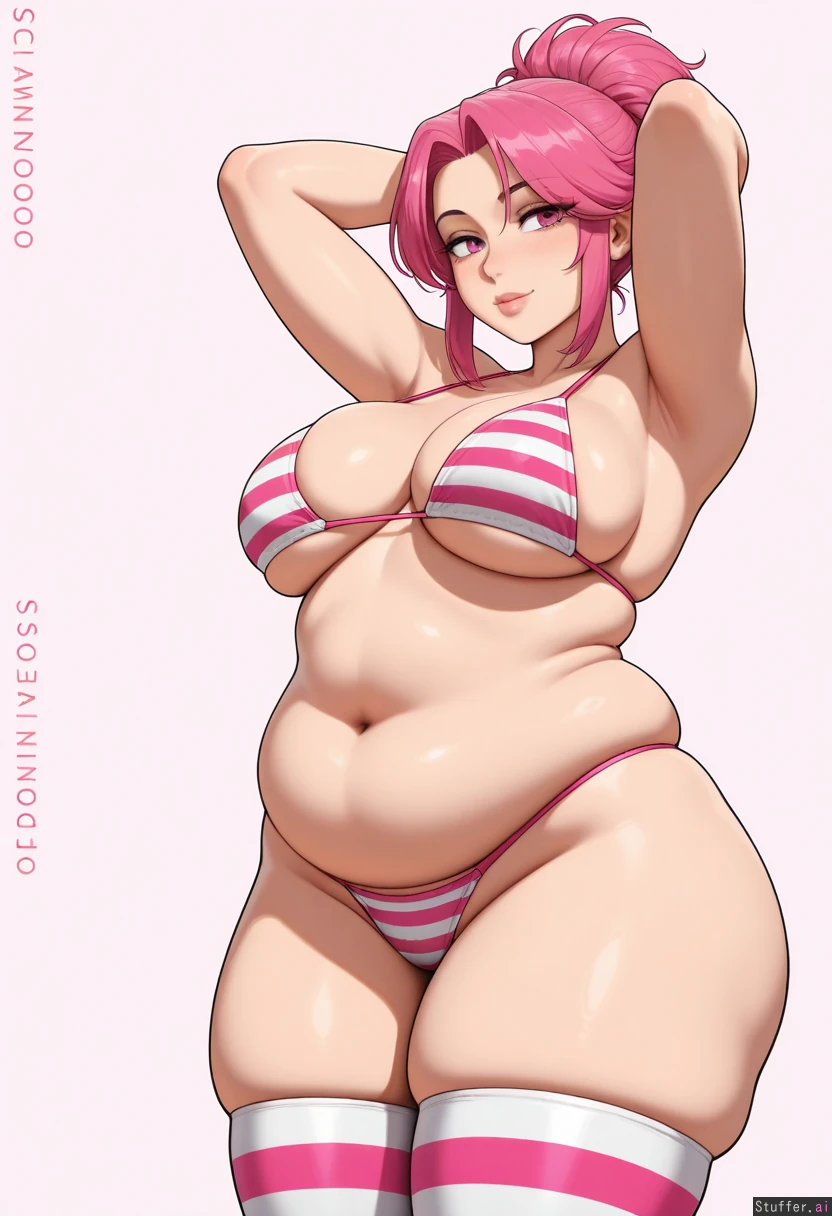 1girl, solo, beautiful, cute, gorgeous, e-girl, voluminous hair, hair up, sultry look, lewd, seductive, simple background, hands behind head, Krekkov:artist, sciamano240:artist, betterwithsalt:artist, Wearing pink striped bikini, tight bikini, thigh_highs, boob squish, thigh_squish, skindentation, Chubby, ((belly_rest:1.2)), ((super_chubby_belly:1.6)), love_handles, fat_thighs, fattening, (thick_hips), belly_bulge, (fat_rolls:1.2), plump, (fat_belly:1.1), soft_belly