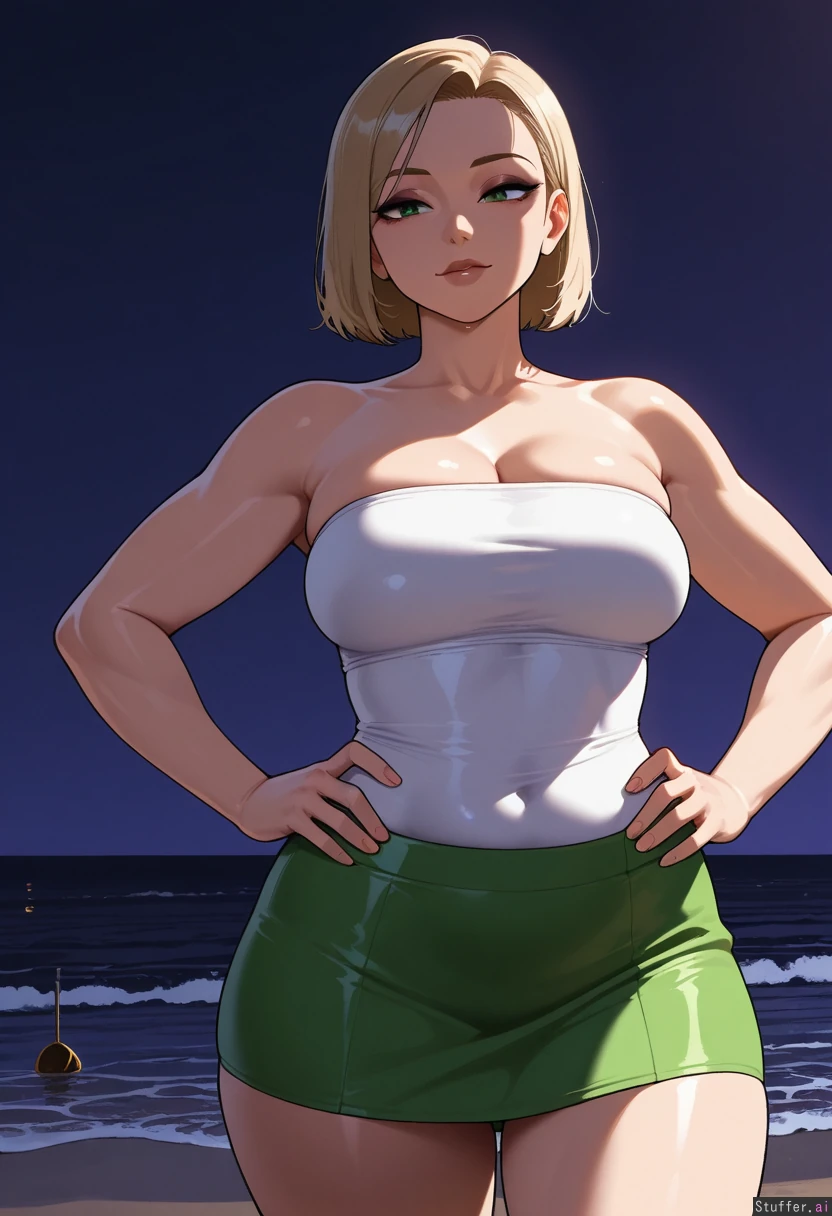 masterpiece, amazing resolution, nyantcha(artist), krekkov(artist), dramatic lighting , intricate details , detailed eyes, hdr, best quality, (soft shading), dim lighting, realistic lighting , no windows, dark purple lighting, (bimbo, light brown hair, green eyes), Takako Uro from Jujustu Kaisen, dark eyeshadow, curvy, (chubby:0.5), full breasts, front view, outside on beach ,chubby, Short hair, falling toward her shoulders, slightly layered and natural hair, parted near middle, no bangs, volume natural straight_hair, Hands on hips, (Top: fitted tube top, (white tube top), fabric is tight and slightly wrinkled, clinging to her torso and emphasizing a streamlined shape, scoop neckline), (Bottoms: loose, polyester, low-waisted sea green short skirt, the short skirt is relaxed, there's visible gathering at the waist, showing elastic fit and chub),