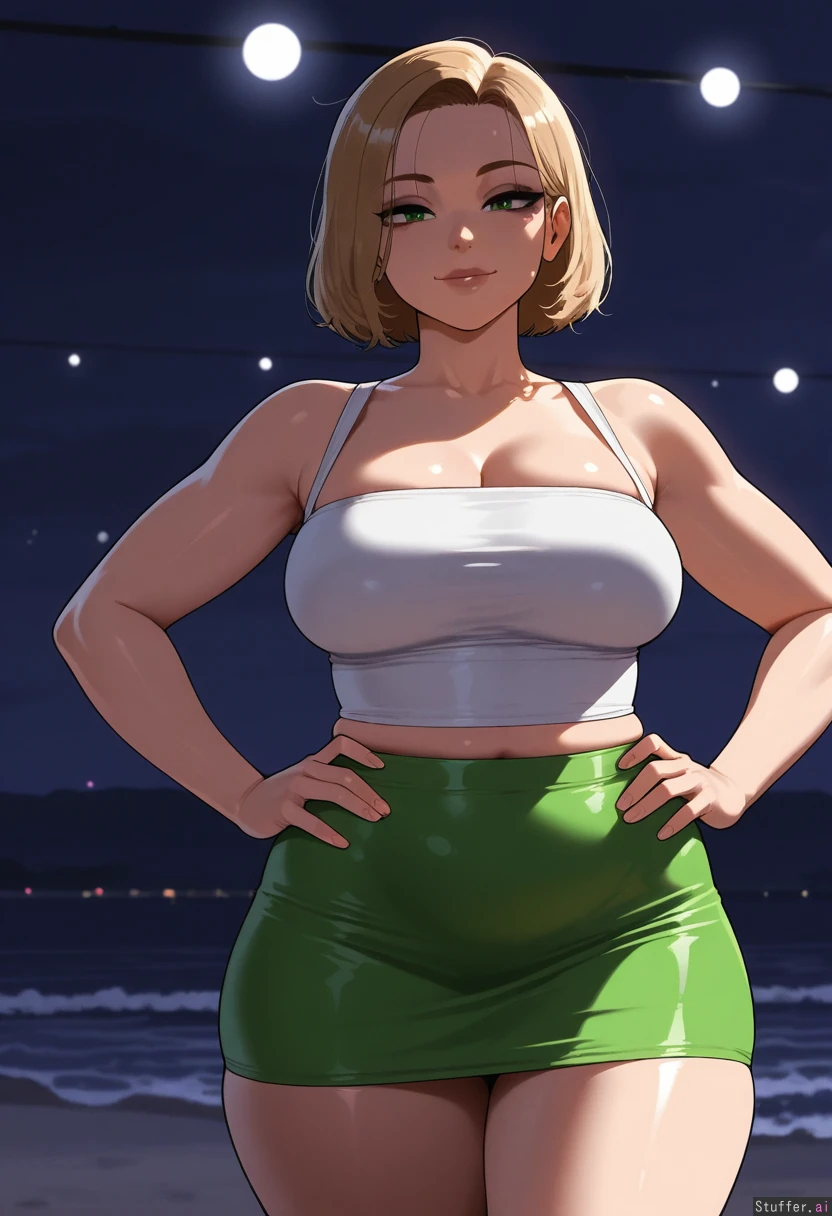 masterpiece, amazing resolution, nyantcha(artist), krekkov(artist), dramatic lighting , intricate details , detailed eyes, hdr, best quality, (soft shading), dim lighting, realistic lighting , no windows, dark purple lighting, (bimbo, light brown hair, green eyes), soft mommy girlfriend, dark eyeshadow, curvy, (chubby:0.5), full breasts, front view, outside on beach ,chubby, Short hair, falling toward her shoulders, slightly layered and natural hair, parted near middle, no bangs, volume natural straight_hair, Hands on hips, (Top: fitted tube top, (white tube top), fabric is tight and slightly wrinkled, clinging to her torso and emphasizing a streamlined shape, scoop neckline), (Bottoms: loose, polyester, low-waisted sea green short skirt, the short skirt is relaxed, there's visible gathering at the waist, showing elastic fit and chub),