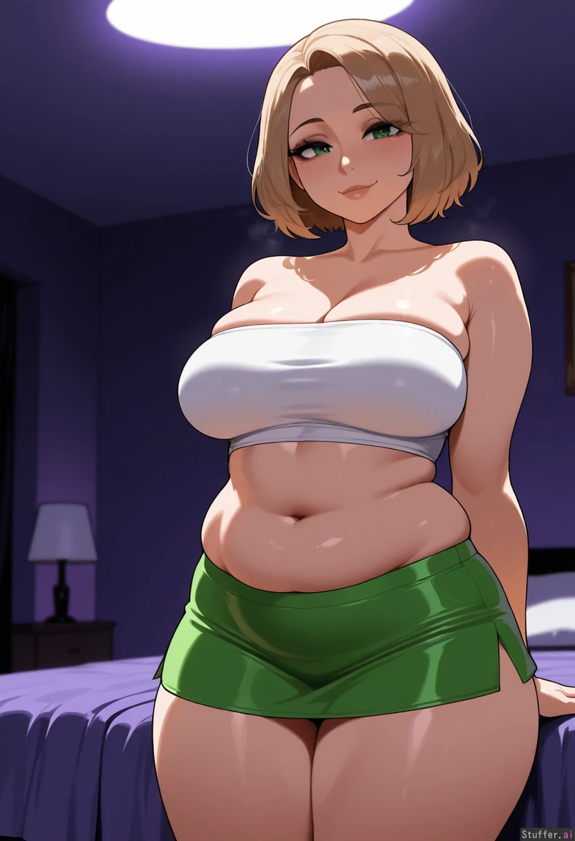 masterpiece, amazing resolution, nyantcha(artist), krekkov(artist), dramatic lighting , intricate details , detailed eyes, hdr, best quality, (soft shading), dim lighting, realistic lighting , no windows, dark purple lighting, (bimbo, light brown hair, green eyes), soft mommy girlfriend, dark eyeshadow, curvy, (chubby:0.5), full breasts, pudgy belly, (chubby thighs:1.2), looking at viewer, viewer looking at her, inside on bed ,chubby, Short hair, falling toward her shoulders, slightly layered and natural hair, parted near middle, no bangs, volume natural straight_hair, Arms crossed, (Top: fitted tube top, (white tube top), fabric is tight and slightly wrinkled, clinging to her torso and emphasizing a streamlined shape, scoop neckline), (Bottoms: loose, polyester, low-waisted sea green short skirt, the short skirt is relaxed, there's visible gathering at the waist, showing elastic fit and chub),