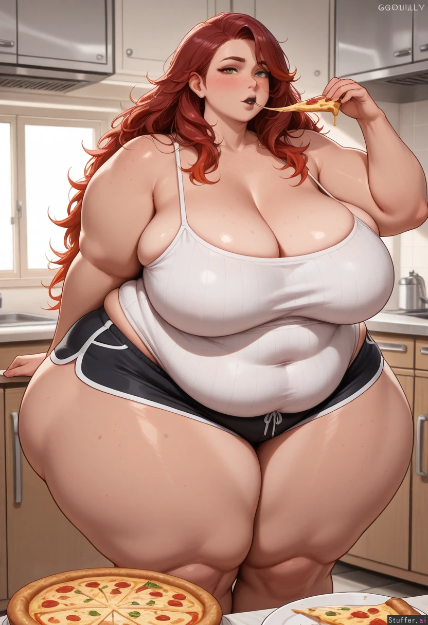 (((masterpiece, best quality, 8K resolution, focus on details, best quality possible, sharp image, gorgeus, beautiful, highres, vibrant colors, crisp lines, extremely detailed face))), soft lighting, 1girl, solo, (detailed skin, brown skin, realistic skin texture, freckles), dark red hair, messy hair, emerald eyes, black lipstick, Kittew(artist), ((extremely curvy, absurdly voluptuous, severe obese, absurdly thick body)), (huge breasts, sagging breasts, pendulous breasts), ((absudly obese pelvis, extremely obese abdomen, huge fupa)), (defined waist), ((fat rolls)), (absurdly massive hips, broad hips, bottom heavy), (extremely thick thighs, extremely fat legs), ((extremely fat arms, extremely fat face)), black shorts, white camisole, cleavage, standing, eating pizza, kitchen, evening