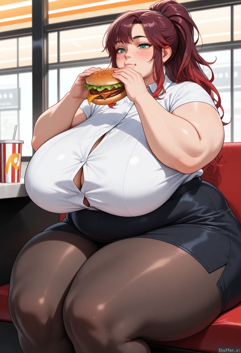 (((masterpiece, best quality, 8K resolution, focus on details, best quality possible, sharp image, gorgeus, beautiful, highres, vibrant colors, crisp lines, extremely detailed face))), soft lighting, 1girl, solo, (detailed skin, brown skin, realistic skin texture, freckles, bangs), dark red hair, tidy hair, ponytail hairstyle, emerald eyes, Kittew(artist), ((extremely curvy, absurdly voluptuous, severe obese, absurdly thick body)), huge breasts, sagging breasts, pendulous breasts, (absudly obese pelvis, extremely obese abdomen, huge fupa), (defined waist), ((fat rolls)), absurdly massive hips, broad hips, bottom heavy, (extremely thick thighs, extremely fat legs), ((extremely fat arms, extremely fat face)), black pantyhose, black high waisted skirt, white buttoned shirt, sitting, eating burger, fast food restaurant, morning.