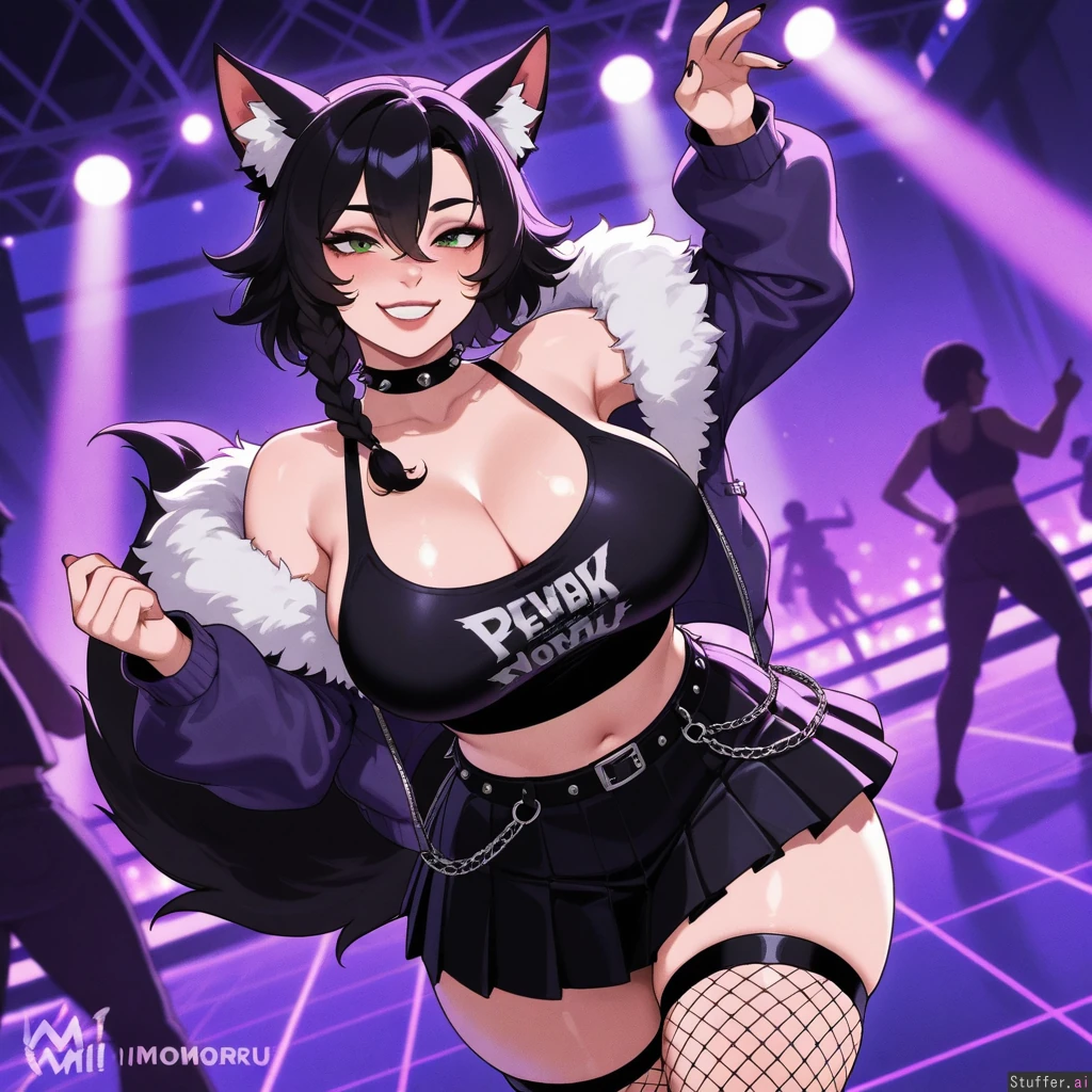 High quality, 4k, masterpiece, flawless, motion lines, perfect shading, bright livid, facing front Nyantcha(artist), KAMII MOMORU(artist), Solo adult woman, One person, Flawless beauty, Wolfgirl, Wolf ears, Wolf tail, Green eyes, Raven Black hair, Braided hair, Shiny clean hair, Cute blushing shy, Happy eyes, White tank top, Punk fluffy jacket, punk skirt, Punk wooly stockings, Punk spiked choker, (Big boobs:0.0), (Chubby:0.0), (Overweight belly:0.0), (fat hips:0.3), (Thick thighs:0.5), (Big overflowing ass:0.0), (Bubble butt:0.3), Nightclub, Dancing,