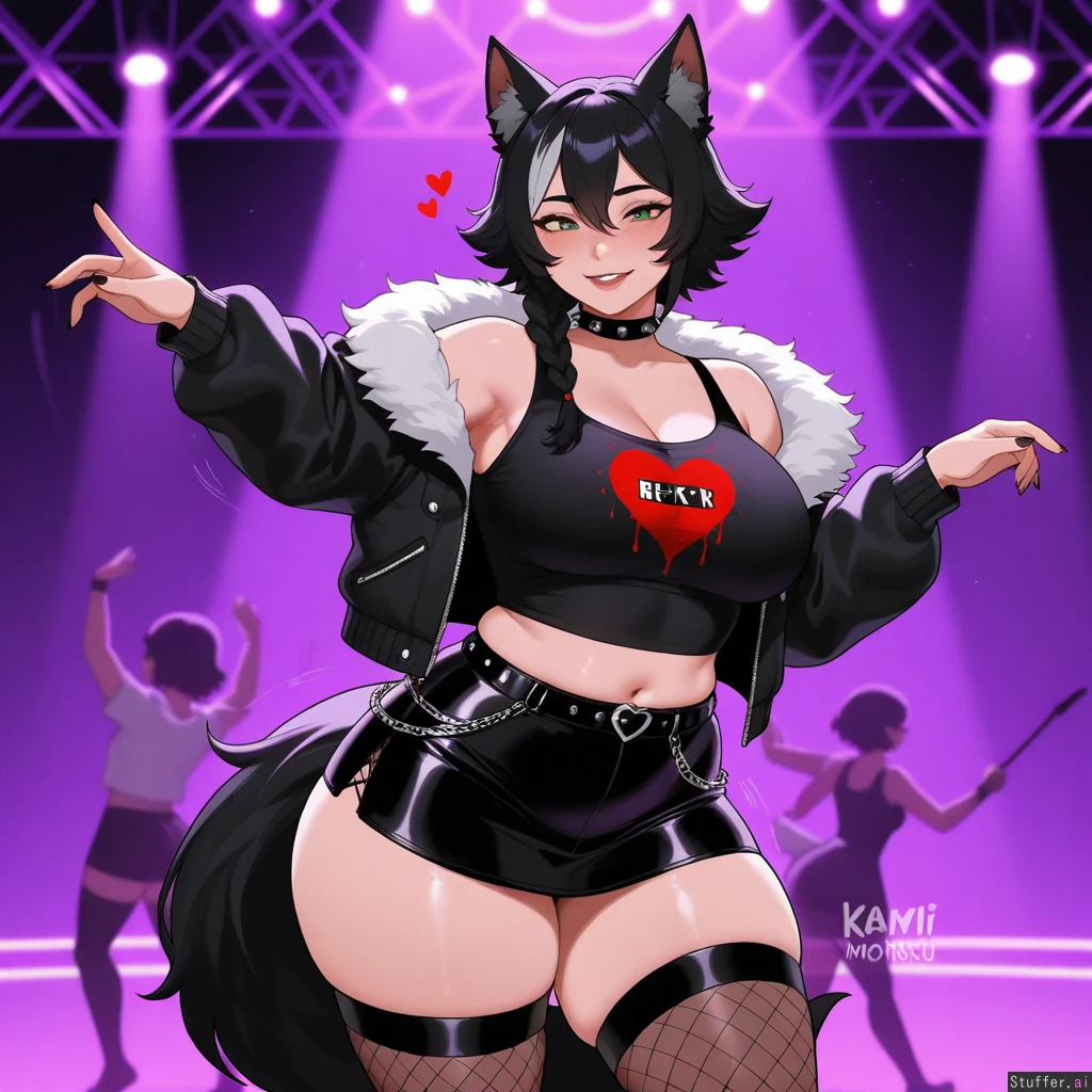 High quality, 4k, masterpiece, flawless, motion lines, perfect shading, bright livid, facing front Nyantcha(artist), KAMII MOMORU(artist), Solo adult woman, One person, Flawless beauty, Wolfgirl, Wolf ears, Wolf tail, Green eyes, Raven Black hair, Braided hair, Shiny clean hair, Cute blushing shy, Happy eyes, White tank top, Punk fluffy jacket, Black punk shirt with evil red heart logo, Black punk skirt, Punk wooly stockings, Punk spiked choker, (Big boobs:0.0), (Chubby:0.9), (Overweight belly:0.5), (fat hips:0.5), (Thick thighs:0.9), (Big overflowing ass:0.7), (Bubble butt:0.9), Nightclub, Dancing,