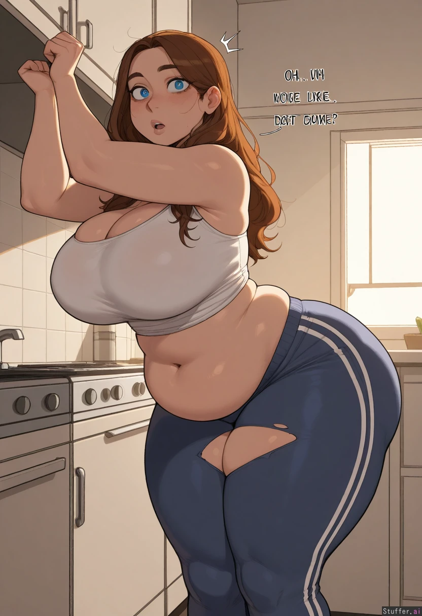 masterpiece, best quality, Kamii momoru, krekkov, best quality, intricate details, hdr, detailed eyes, (soft shading), realistic, warm lighting, realistic lighting, (adult:1.2), 1girl, solo, Brown wavey hair, blue eyes Crazy eyes, shocked, confused, exhausted Grey sweatpants, ripped across the thighs, undersized white top Standing in kitchen, hands raised, leaning forward Skinny fat, fat butt, huge hips, massive thighs, chubby, belly out, deep navel Weight gain:0.8