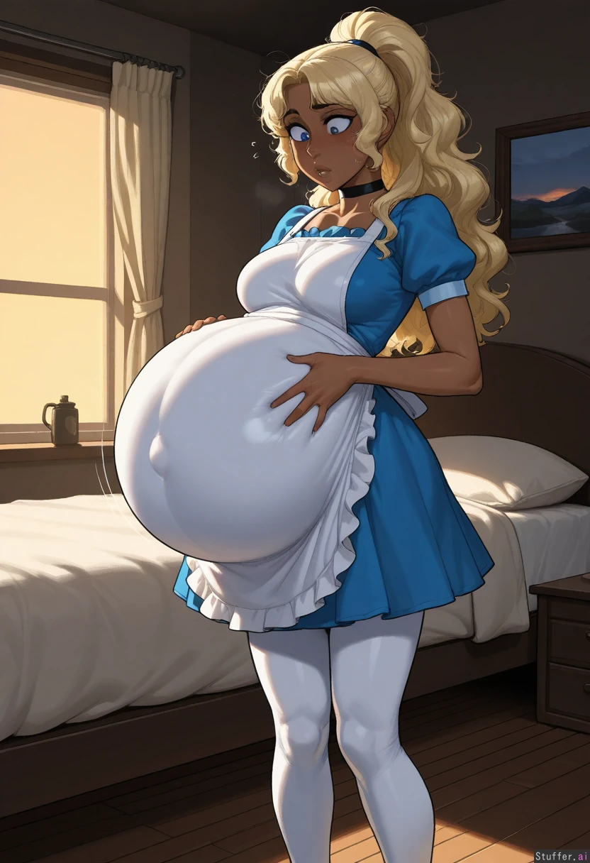 (( solo, krekkov)) (( (blond hair), long_hair, light skin ,high ponytail, dark_blue_eyes, (thick_lips), wavy_hair)) ((White pantyhoes, blue dress, choker, white apron)) ((Medium_breasts:1.0)) ((Thick_thighs:1.0)) ((Skinny:1.5)) (Huge belly inflation:1.3) (( Sunlight, dawn, bedroom, standing dark_room)) (Shocked_expression, panicked:1.3) (Looking down, hands on belly)