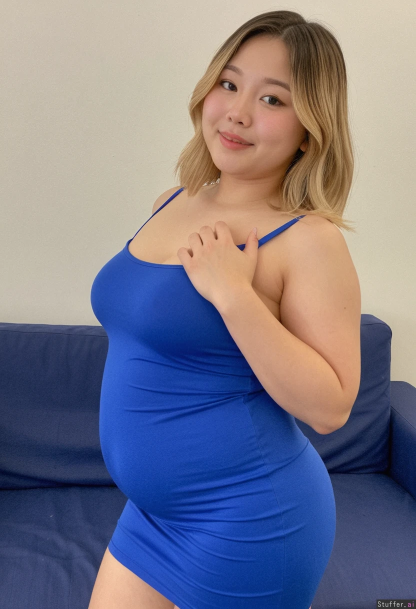 18 year old K-pop Korean standing next to a couch, beautiful tight blue dress , shoulder length hair with a slight wave with blonde highlights