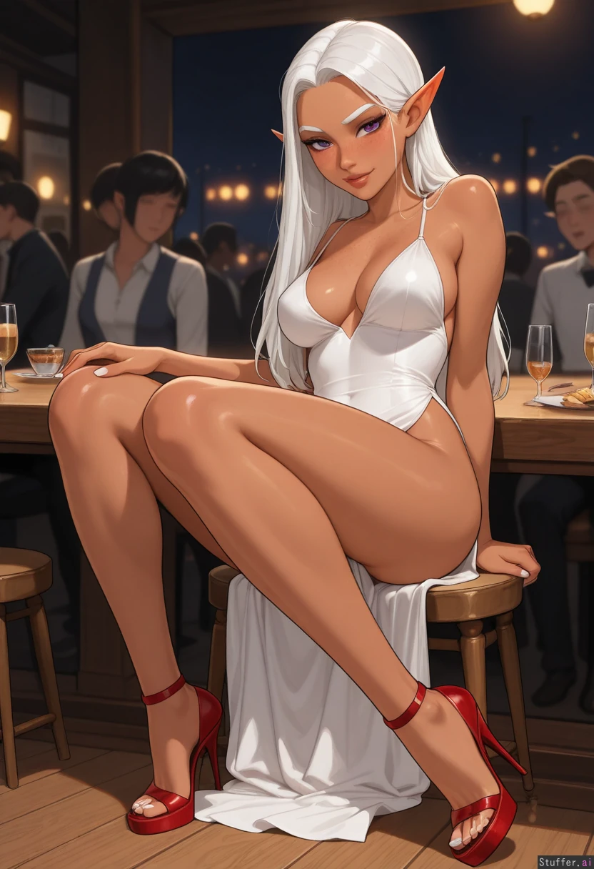 ((High quality Illustration)), ((perfect proportions, perfect anatomy)), solo, ((1 woman)), solo girl, (pewbutt(artist):1.5), (KAMII MOMORU(artist):1.1), (kittew(artist):1.0), (reiq(artist)), ((Brown skin, tomboy, pointy elf ears, white nail polish, adult woman, white straight hair, thick white eyebrows, purple eyes, freckles, natural lips)), ((Dark lighting, moody restaurant)), sitting at a dinner table, sitting across from the viewer, people in the background, looking at viewer, Open toed red heels, long white dress, white nail polish, Heels touching viewers bulge under the table, Seductive eyes, horny, blushing, seductive expression, smiling, medium breasts, medium thighs, (Skinny:1.2),