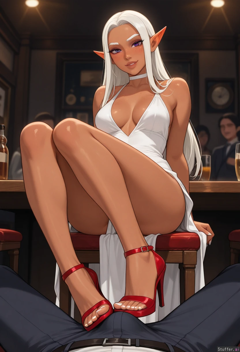 ((High quality Illustration)), ((perfect proportions, perfect anatomy)), solo, ((1 woman)), solo girl, (pewbutt(artist):1.5), (KAMII MOMORU(artist):1.1), (kittew(artist):1.0), (reiq(artist)), ((Brown skin, tomboy, pointy elf ears, white nail polish, adult woman, white straight hair, thick white eyebrows, purple eyes, freckles, natural lips)), ((Dark lighting, moody restaurant)), pov, sitting on a chair at a dinner table, people in the background, looking at viewer, Open toed red heels, long white dress, white nail polish, Secret footjob under the table, toes, bulge, Seductive eyes, horny, blushing, seductive expression, smiling, medium breasts, medium thighs, (Skinny:1.2),