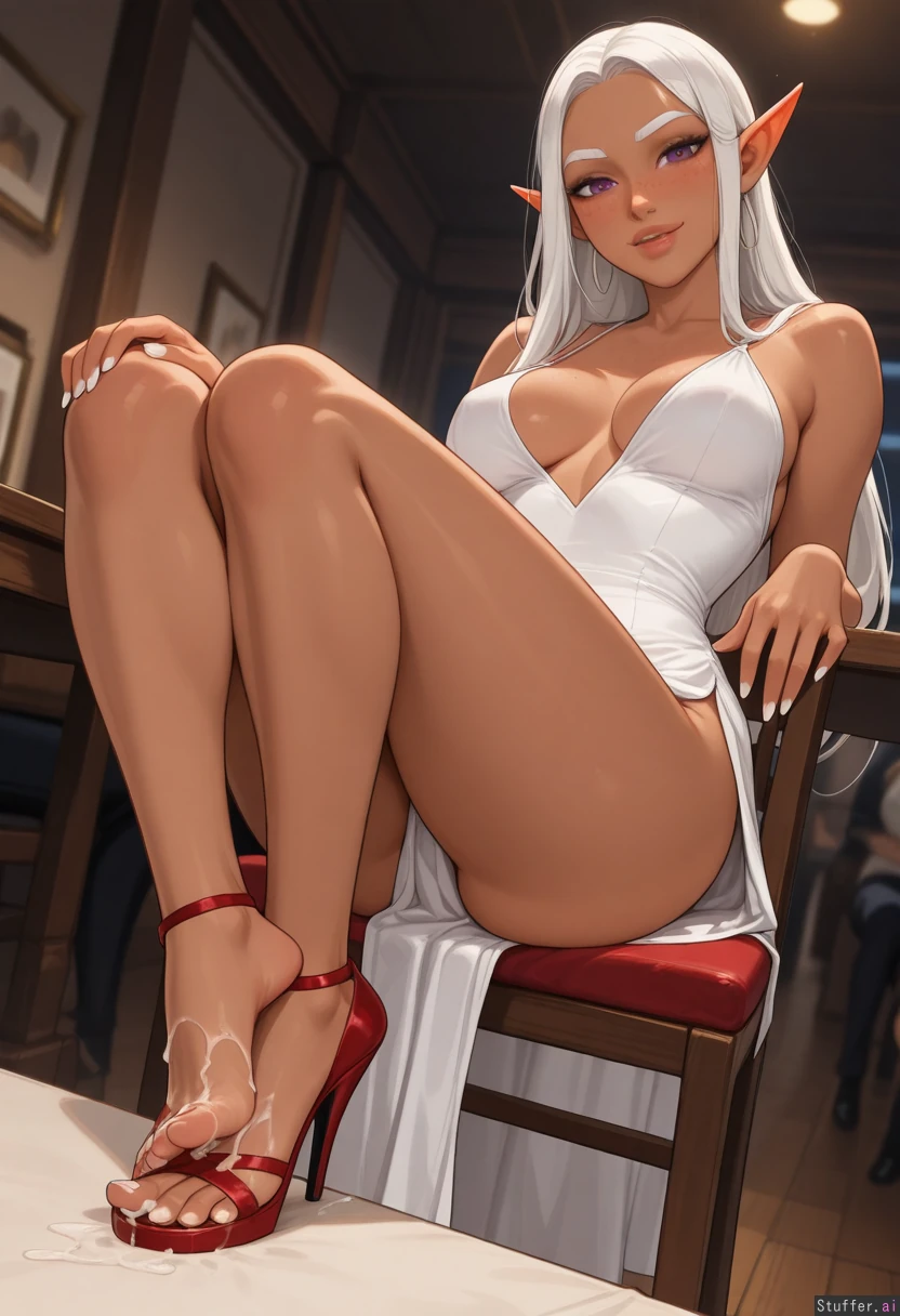 ((High quality Illustration)), ((perfect proportions, perfect anatomy)), solo, ((1 woman)), solo girl, (pewbutt(artist):1.5), (KAMII MOMORU(artist):1.1), (kittew(artist):1.0), (reiq(artist)), ((Brown skin, tomboy, pointy elf ears, white nail polish, adult woman, white straight hair, thick white eyebrows, purple eyes, freckles, natural lips)), ((Dark lighting, moody restaurant)), wide angle view, sitting on a chair at a dinner table, people in the background, looking at viewer, open toed red heels, long white dress, white nail polish, Foot fetish, toes, cum on toes, Seductive eyes, horny, blushing, seductive expression, smiling, medium breasts, medium thighs, (Skinny:1.2),