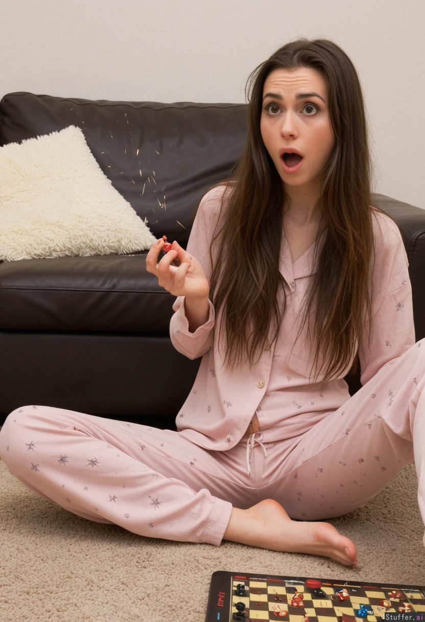 27 years old, bedroom, dark brown hair, pale-skin, brown eyes, super long hair, (baggy pajama pants, short, loose pajama shirt):1, sitting on floor in living room, messy hair, thin thighs, thin arms, skinny, thin waist, big lips, perky_breasts, playing board game, (shocked_expression, sparks from board game):1.1