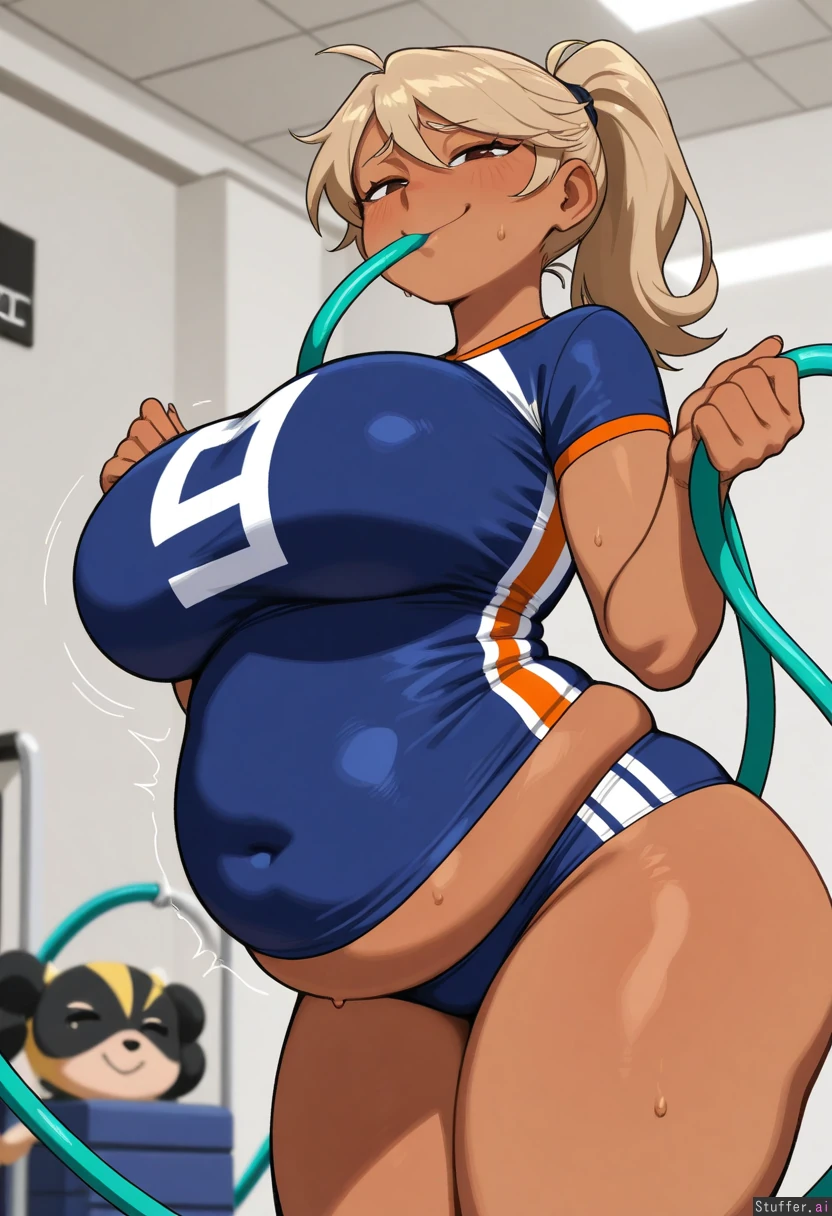 absurdres, 8k, perfect anatomy, masterpiece , plain face , ,nantekottai25, lightsource, wamudraws ,,noodlenood, whoopsatro, , usa37107692, 1girl, solo , (tall female:1), tomboy, brown_eyes , brown_skin , light brown hair, ponytail, dark blue volleyball_uniform, sports panties, large_breasts, potbelly , chubby , fat belly, covered belly, smug , gym, rolls , low angle, (hose in mouth:1.2), motion_lines, puffed cheeks, full mouth, excited , bloated, hands_on_belly , full belly, stuffed_belly , wince, arched_back , underbelly