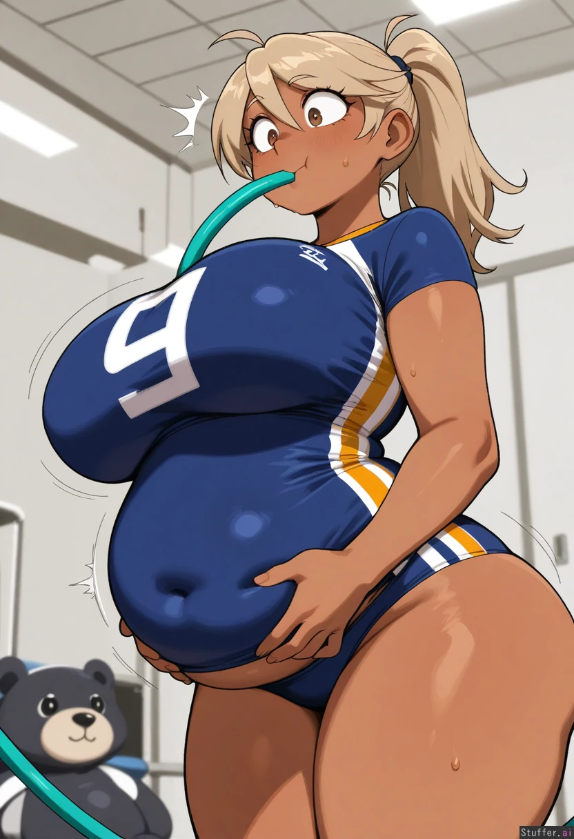 absurdres, 8k, perfect anatomy, masterpiece , plain face , ,nantekottai25, lightsource, wamudraws ,,noodlenood, whoopsatro, , usa37107692, 1girl, solo , (tall female:1), tomboy, brown_eyes , brown_skin , light brown hair, ponytail, dark blue volleyball_uniform, sports panties, large_breasts, potbelly , chubby , fat belly, (covered belly:1.1) , gym, rolls , low angle, (hose in mouth:1.2), motion_lines, puffed cheeks, full mouth, excited , bloated, hands_on_belly , full belly, stuffed_belly , wide eyed, arched_back , underbelly , round_breasts , chest up,