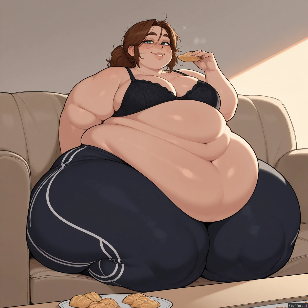 masterpiece, best quality, Kamii momoru, krekkov, best quality, intricate details, hdr, detailed eyes, (soft shading), realistic, dim lighting, realistic lighting, 1girl, solo, Brown wavey hair, blue eyes, excited, flirty, American ussbbw girl, college aged, fat round face, fat double chin, full lips, freckles, bright blue eyes, long eyelashes, short brunette messy hair, bangs, loose ponytail, seductive smile, (((hyper obese:0.5))), (((hyper obese hips))), (((hyper obese thighs))), (((hyper obese belly))), fat arms, medium breasts Sitting on couch, wearing a bra and underwear, (eating pastries), full body