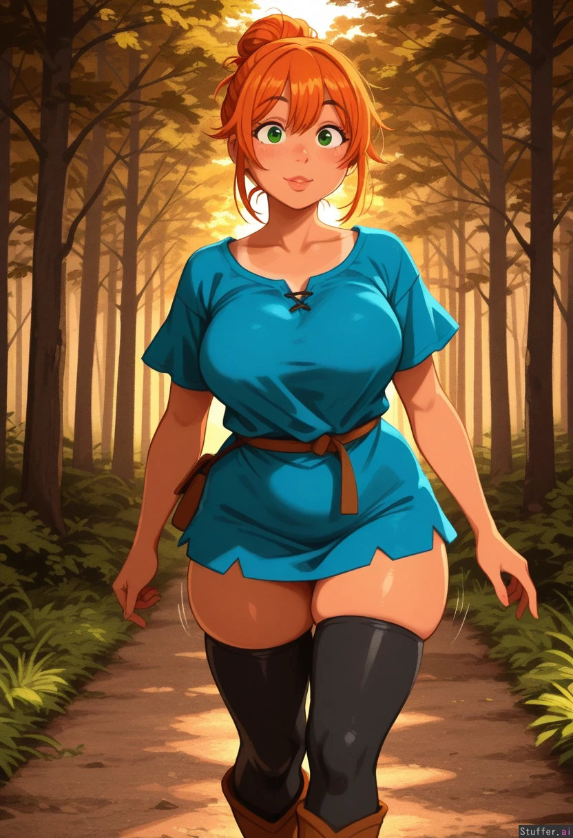 highly detailed, best quality, perfect anatomy, perfect proportions, perfect lighting, warm lighting, perfect shading, beautiful face, beautiful eyes, Krekkov /(artist/), KAMII MOMORU /(artist/), (khyle /(artist/)), Digital.apathy(artist), textless, sunny, woodland forest 1woman,(tanned skin), very tan, orange hair, green eyes,, messy bun , (skindentation:1.5), (motion lines), jiggling, tunic, hoes, leather boots blushing, plump lips, puffy lips, skinny, walking
