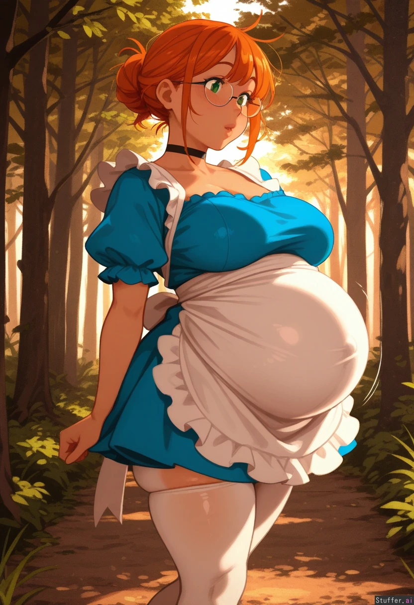 highly detailed, best quality, perfect anatomy, perfect proportions, perfect lighting, warm lighting, perfect shading, beautiful face, beautiful eyes, Krekkov /(artist/), KAMII MOMORU /(artist/), (khyle /(artist/)), Digital.apathy(artist), textless, sunny, woodland forest 1woman,(tanned skin), very tan, orange hair, green eyes,, messy bun , (skindentation:1.5), (motion lines), jiggling, ((White pantyhose, blue dress, choker, white apron, glasses)) blushing, plump lips, puffy lips, (huge pregnant belly:0.87) underbelly skinny, walking