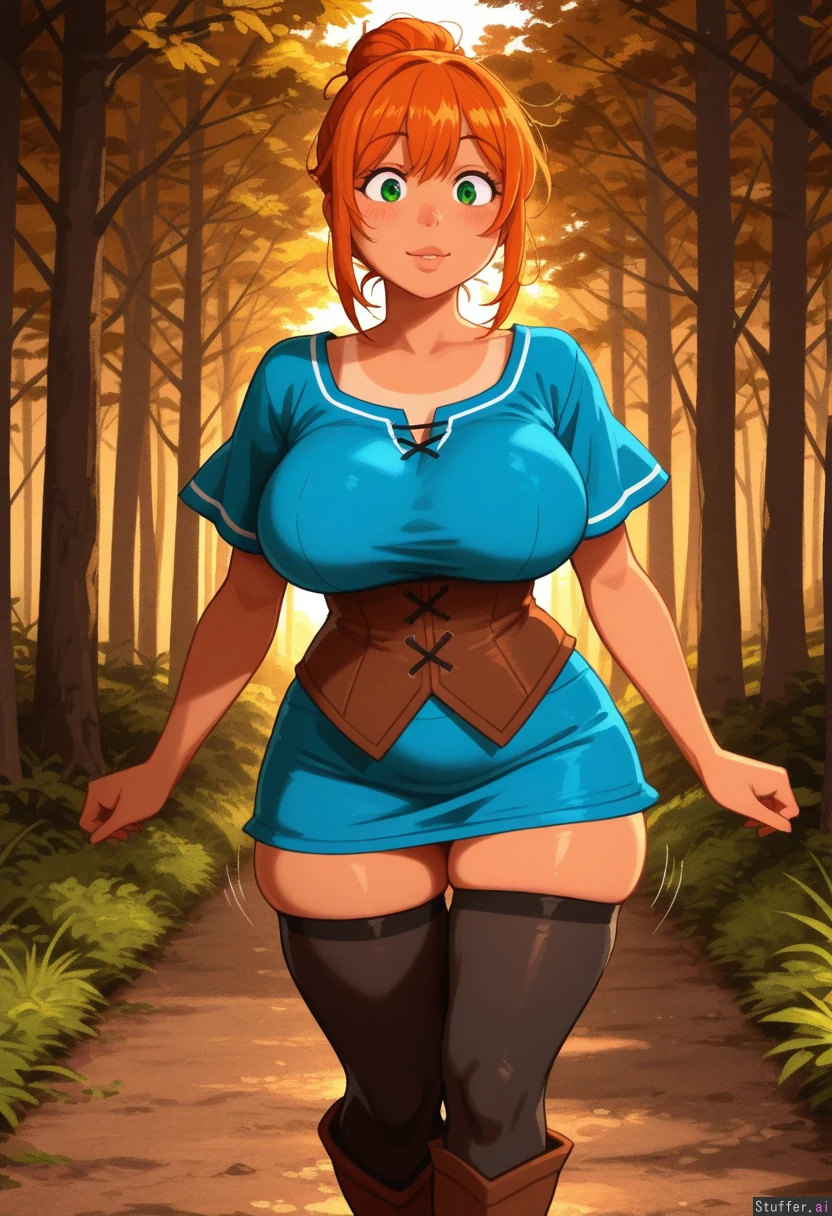 highly detailed, best quality, perfect anatomy, perfect proportions, perfect lighting, warm lighting, perfect shading, beautiful face, beautiful eyes, Krekkov /(artist/), KAMII MOMORU /(artist/), (khyle /(artist/)), Digital.apathy(artist), textless, sunny, woodland forest 1woman,(tanned skin), very tan, orange hair, green eyes,, messy bun , (skindentation:1.5), (motion lines), jiggling, blue tunic, pantyhose, leather boots, corset (huge belly expansion:0.87) blushing, plump lips, puffy lips, skinny, walking