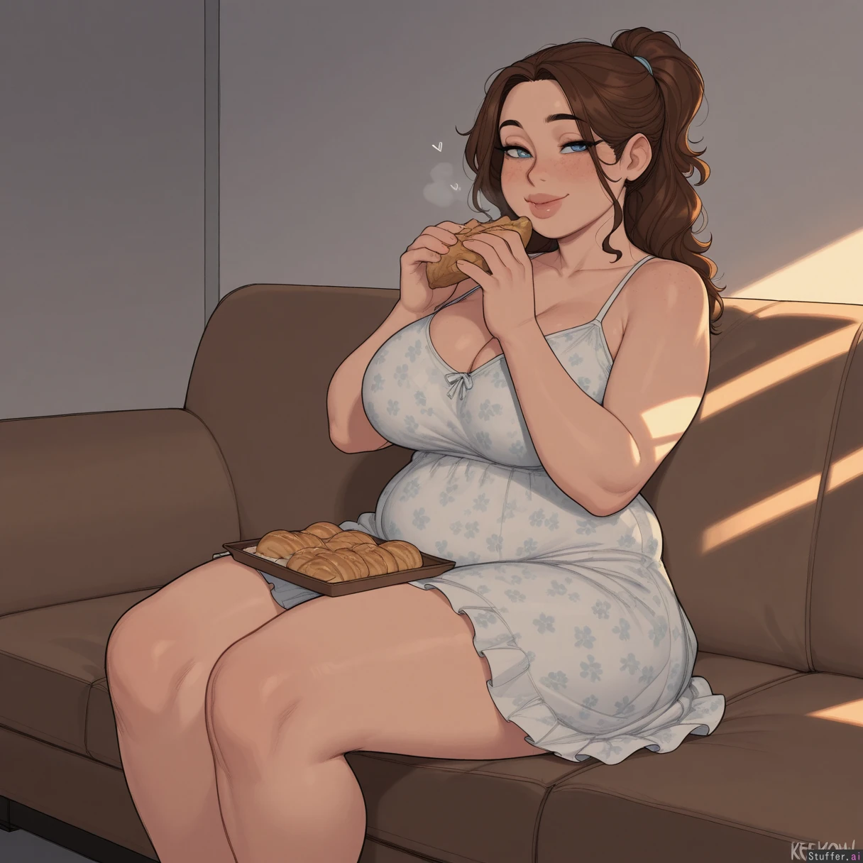 masterpiece, best quality, Kamii momoru, krekkov, best quality, intricate details, hdr, detailed eyes, (soft shading), realistic, dim lighting, realistic lighting, 1girl, solo, Brown wavey hair, blue eyes, excited, flirty, American ussbbw girl, college aged, fat round face, fat double chin, full lips, freckles, bright blue eyes, long eyelashes, short brunette messy hair, bangs, loose ponytail, seductive smile, (obese, obese hips, hyper obese thighs, hyper obese belly, fat arms, medium breasts:0.5) Sitting on couch, wearing a floral print sundress, (eating pastries), full body