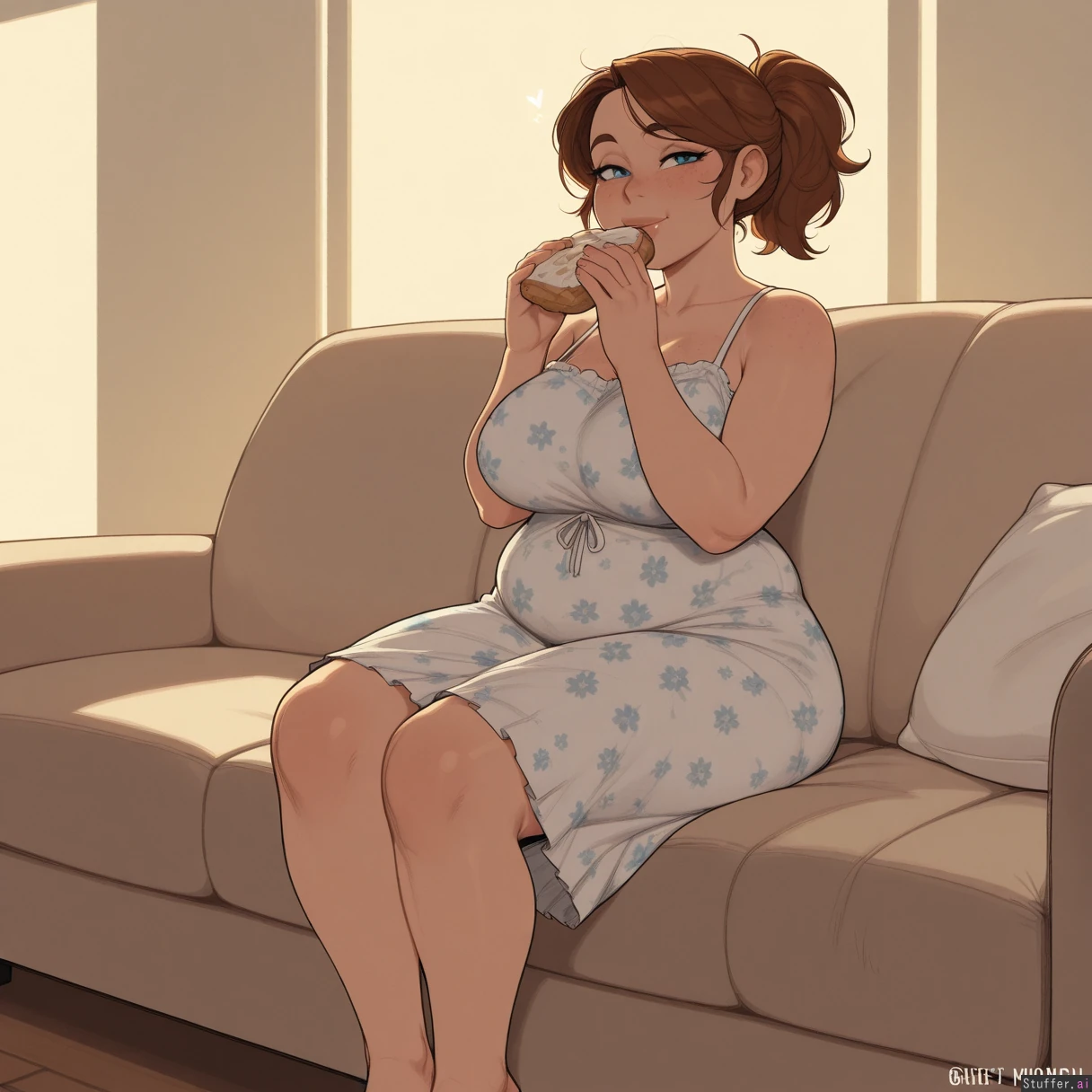 masterpiece, best quality, Kamii momoru, krekkov, best quality, intricate details, hdr, detailed eyes, (soft shading), realistic, dim lighting, realistic lighting, 1girl, solo, Brown wavey hair, blue eyes, excited, flirty, American ussbbw girl, college aged, fat round face, fat double chin, full lips, freckles, bright blue eyes, long eyelashes, short brunette messy hair, bangs, loose ponytail, seductive smile, (obese, obese hips, hyper obese thighs, hyper obese belly, fat arms, medium breasts:0.5) Sitting on couch, wearing a floral print sundress, (eating pastries), full body