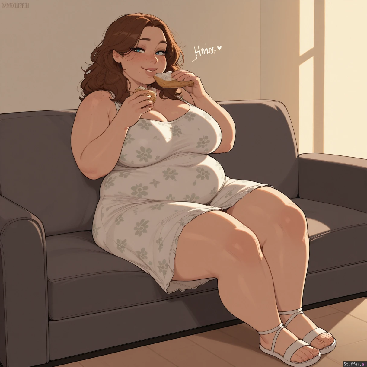 masterpiece, best quality, Kamii momoru, krekkov, best quality, intricate details, hdr, detailed eyes, (soft shading), realistic, dim lighting, realistic lighting, 1girl, solo, Brown wavey hair, blue eyes, excited, flirty, American ussbbw girl, college aged, fat round face, fat double chin, full lips, freckles, bright blue eyes, long eyelashes, short brunette messy hair, bangs, loose ponytail, seductive smile, (obese, obese hips, hyper obese thighs, hyper obese belly, fat arms, medium breasts:0.75) Sitting on couch, wearing a floral print sundress, (eating pastries), full body