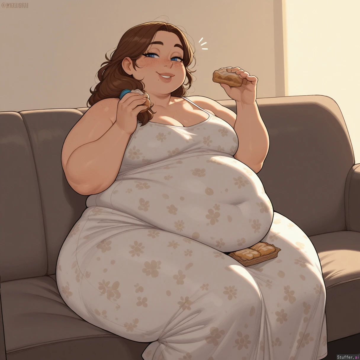 masterpiece, best quality, Kamii momoru, krekkov, best quality, intricate details, hdr, detailed eyes, (soft shading), realistic, dim lighting, realistic lighting, 1girl, solo, Brown wavey hair, blue eyes, excited, flirty, American ussbbw girl, college aged, fat round face, fat double chin, full lips, freckles, bright blue eyes, long eyelashes, short brunette messy hair, bangs, loose ponytail, seductive smile, (obese, obese hips, hyper obese thighs, hyper obese belly, fat arms, medium breasts:1.1) Sitting on couch, wearing a floral print sundress, (eating pastries), full body