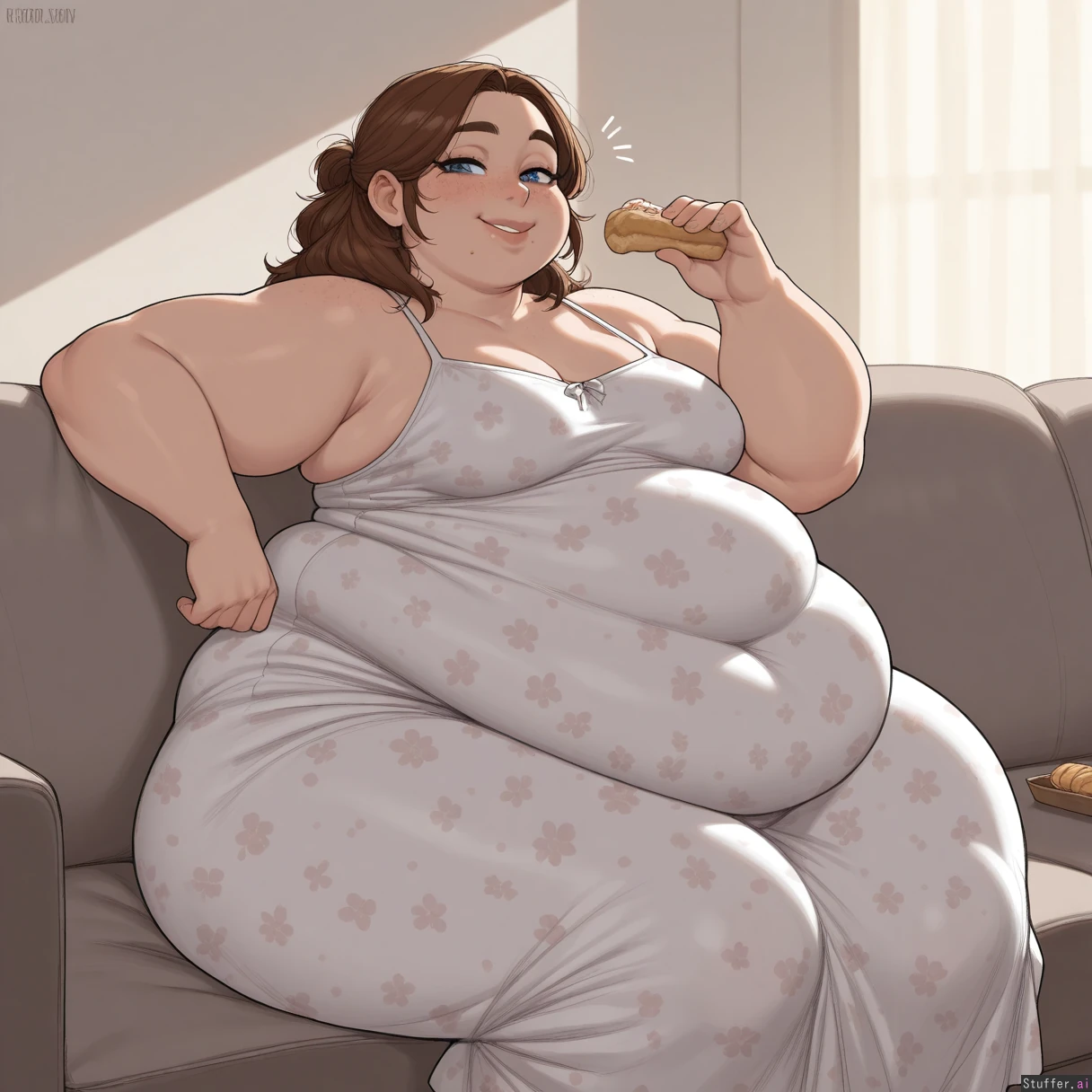 masterpiece, best quality, Kamii momoru, krekkov, best quality, intricate details, hdr, detailed eyes, (soft shading), realistic, dim lighting, realistic lighting, 1girl, solo, Brown wavey hair, blue eyes, excited, flirty, American ussbbw girl, college aged, fat round face, fat double chin, full lips, freckles, bright blue eyes, long eyelashes, short brunette messy hair, bangs, loose ponytail, seductive smile, (obese, obese hips, hyper obese thighs, hyper obese belly, fat arms, medium breasts:1.2) Sitting on couch, wearing a floral print sundress, (eating pastries), full body